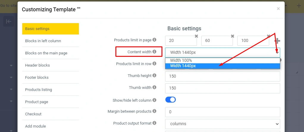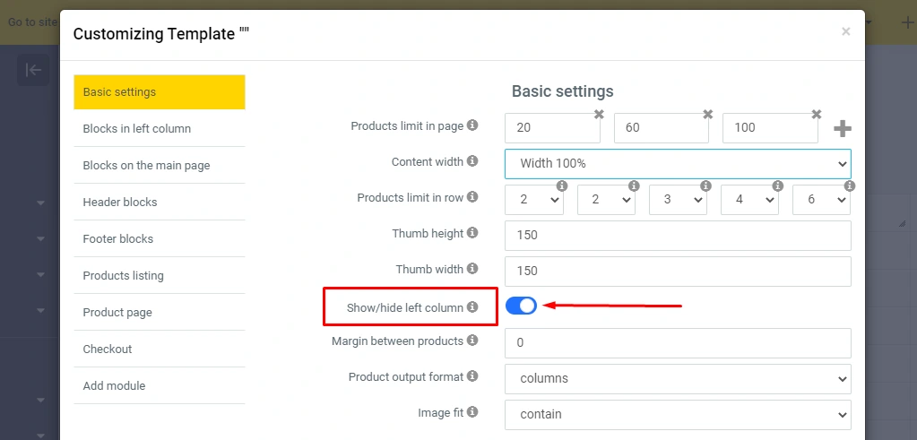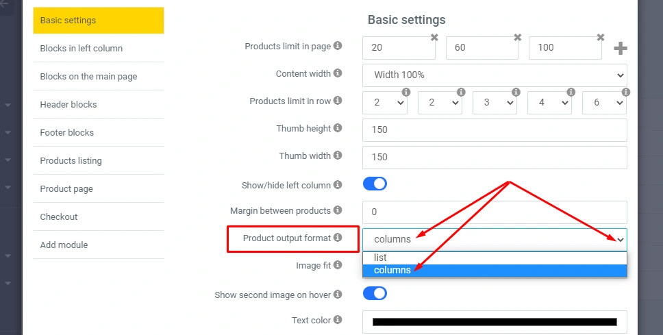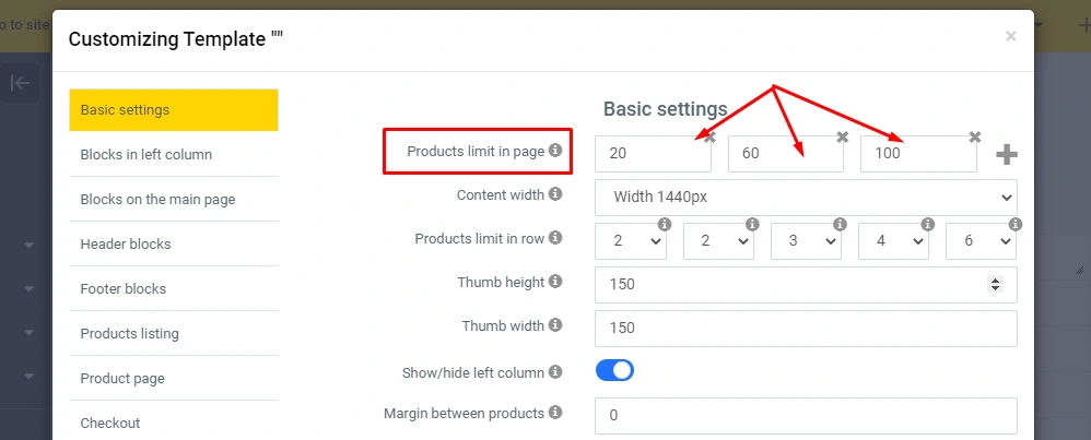 In the "Basic settings" section, in general, you can change the color scheme of your site, the background of the pages, the color of the buttons, the number of products on the page, etc.: