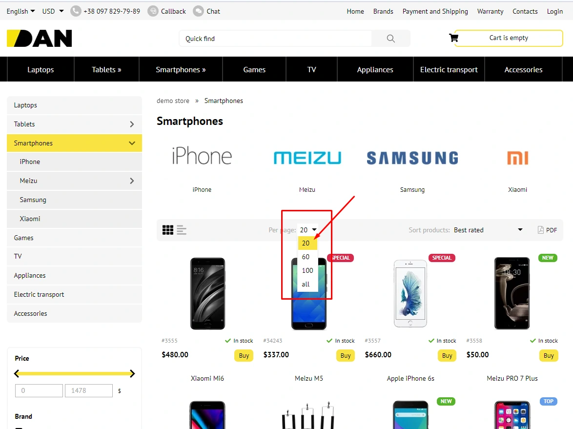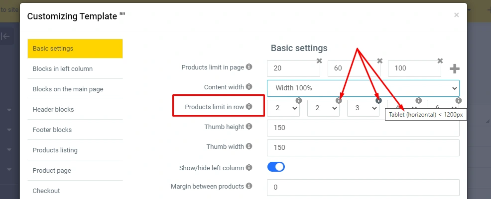 In the admin panel, in the "number of products in a row" block, you can set the appropriate number of output of the product, where each value has a hint under which condition the given value will be output, namely the screen extension (Desktop, tablet, mobile version):