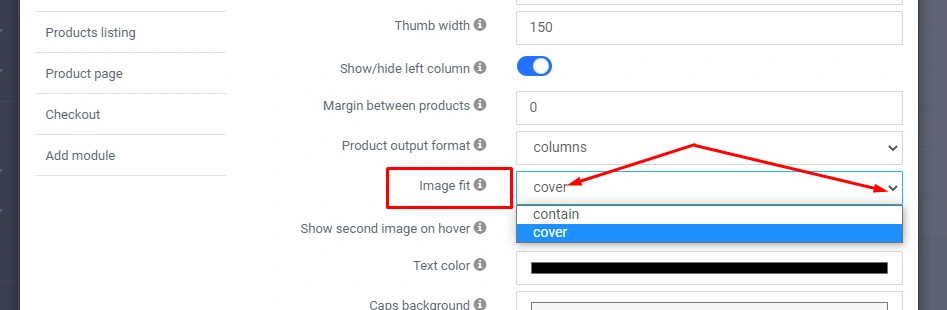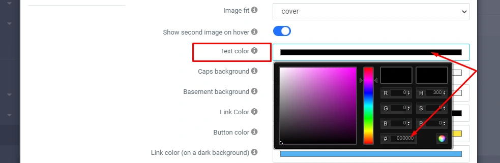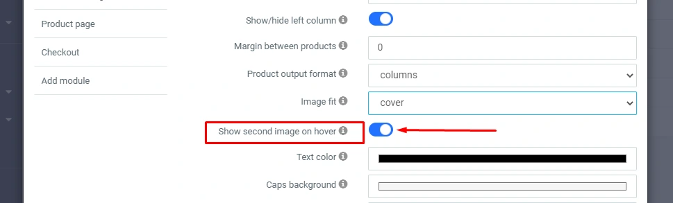 In the "Change picture when hovering" section, you can independently enable/disable the effect of changing one picture to another when hovering over the product block