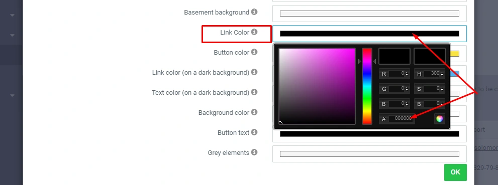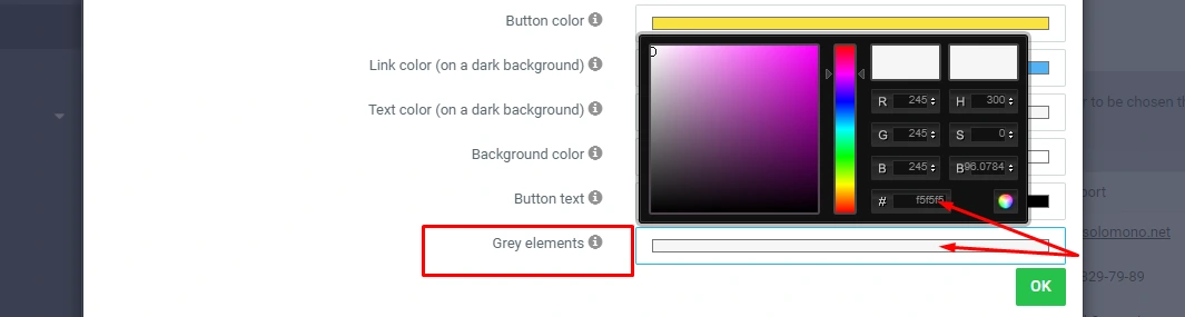 In the "Gray elements" section, you have the opportunity to independently change the background color of some elements of your site, such as: search background; category background in the left column; feedback block background; border of the block of goods when hovering; button in the lower right part of the site, which raises the content up.