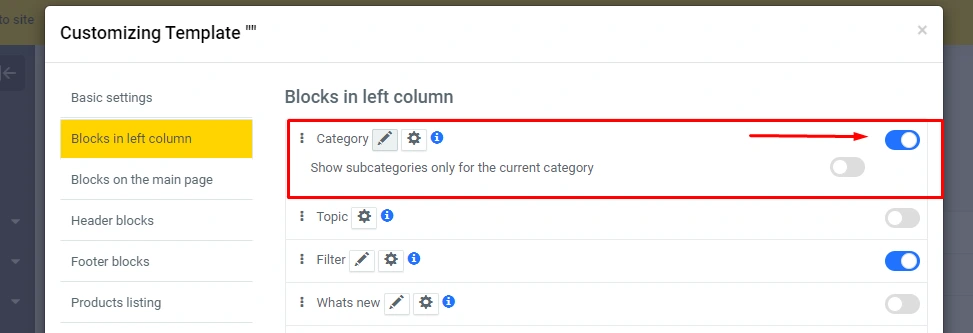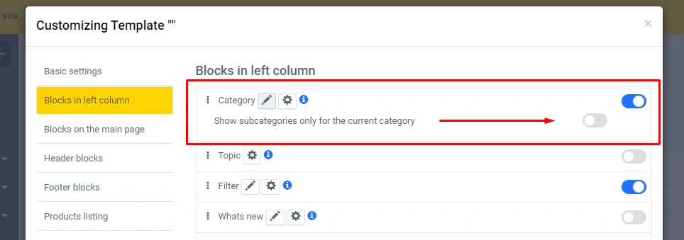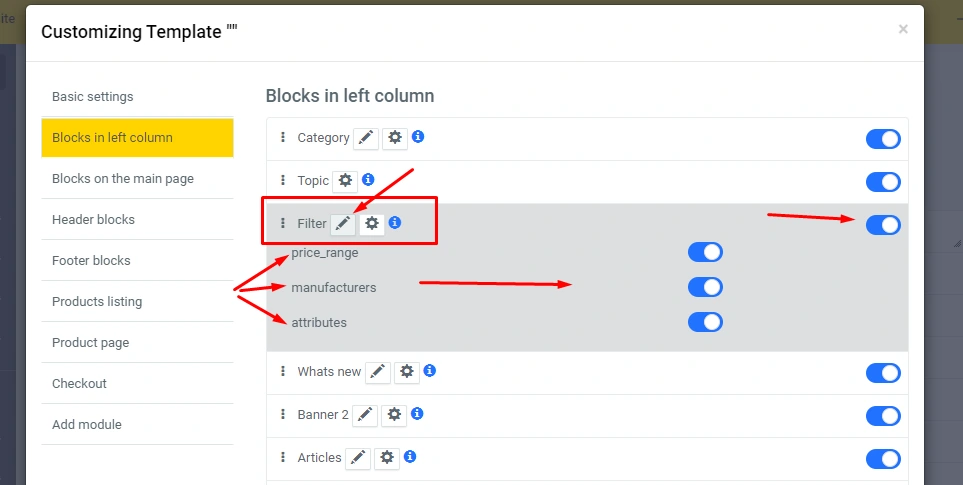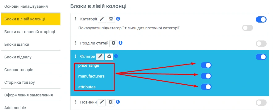 In the "Filters" section, you have the opportunity to directly enable/disable the entire block with filters in the left column of your website on the product categories page