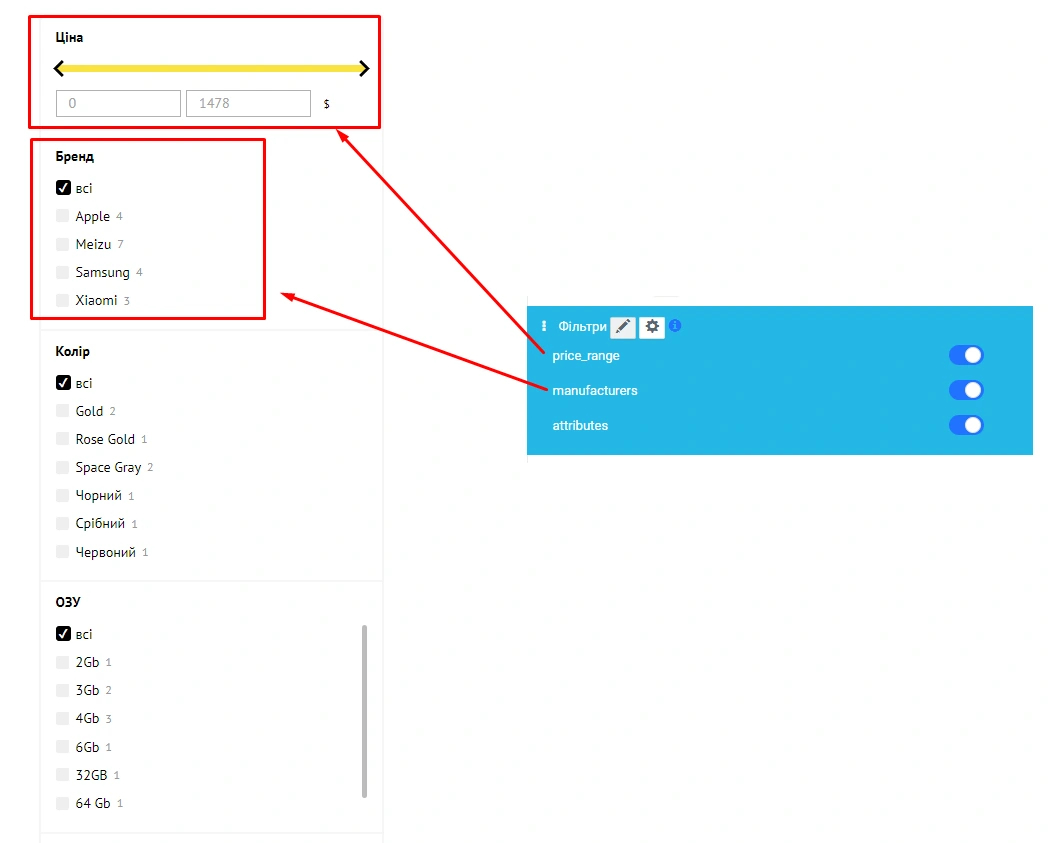 price_range is responsible for displaying the block with the price, and manufacturers is responsible for displaying the block of brands, if they are disabled, the blocks will not be displayed