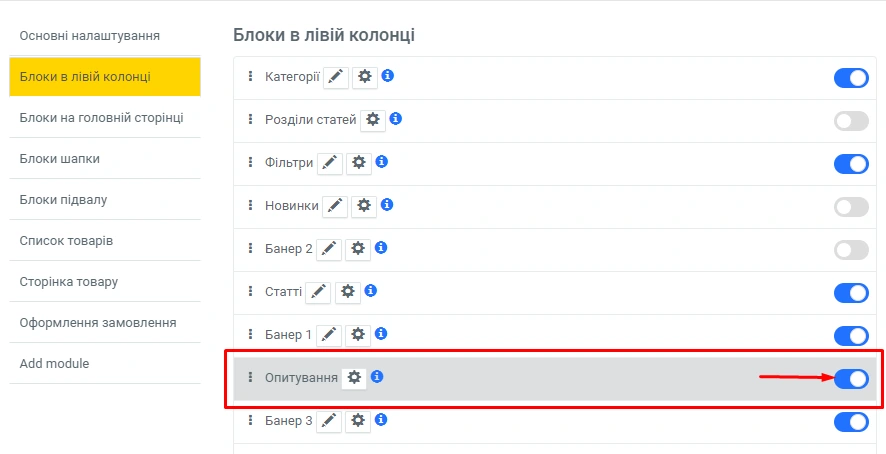 You have the opportunity to change the position of certain blocks in the left column of your site, for this in the admin panel in the "Blocks in the left column" section, you need to click on the "three dots" icon and move the block to the place you need without letting go. down or up, and the blocks in the left column of the site will take the appropriate place according to the admin panel.