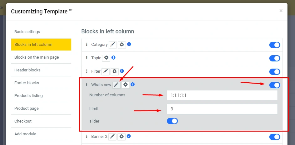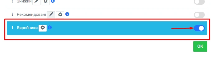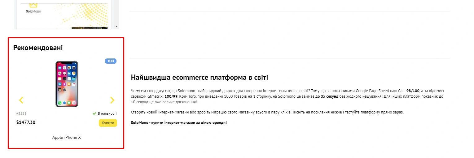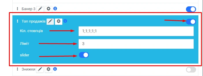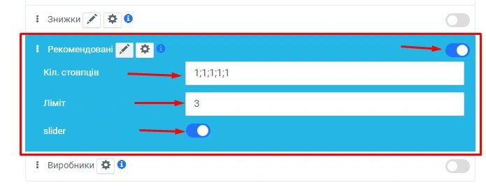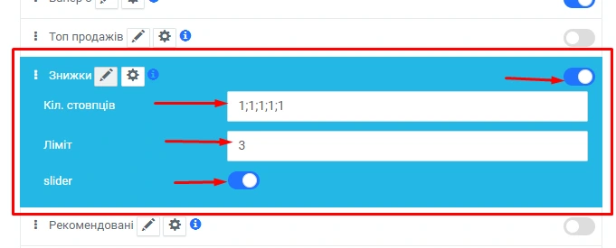 Where you can manage the functionality of this block, set the number of blocks of products in a row, set a limit of products, and there is also an opportunity to choose the display of products in this block or with a slider, or to display all specified products at once.