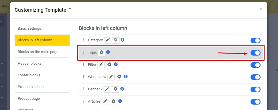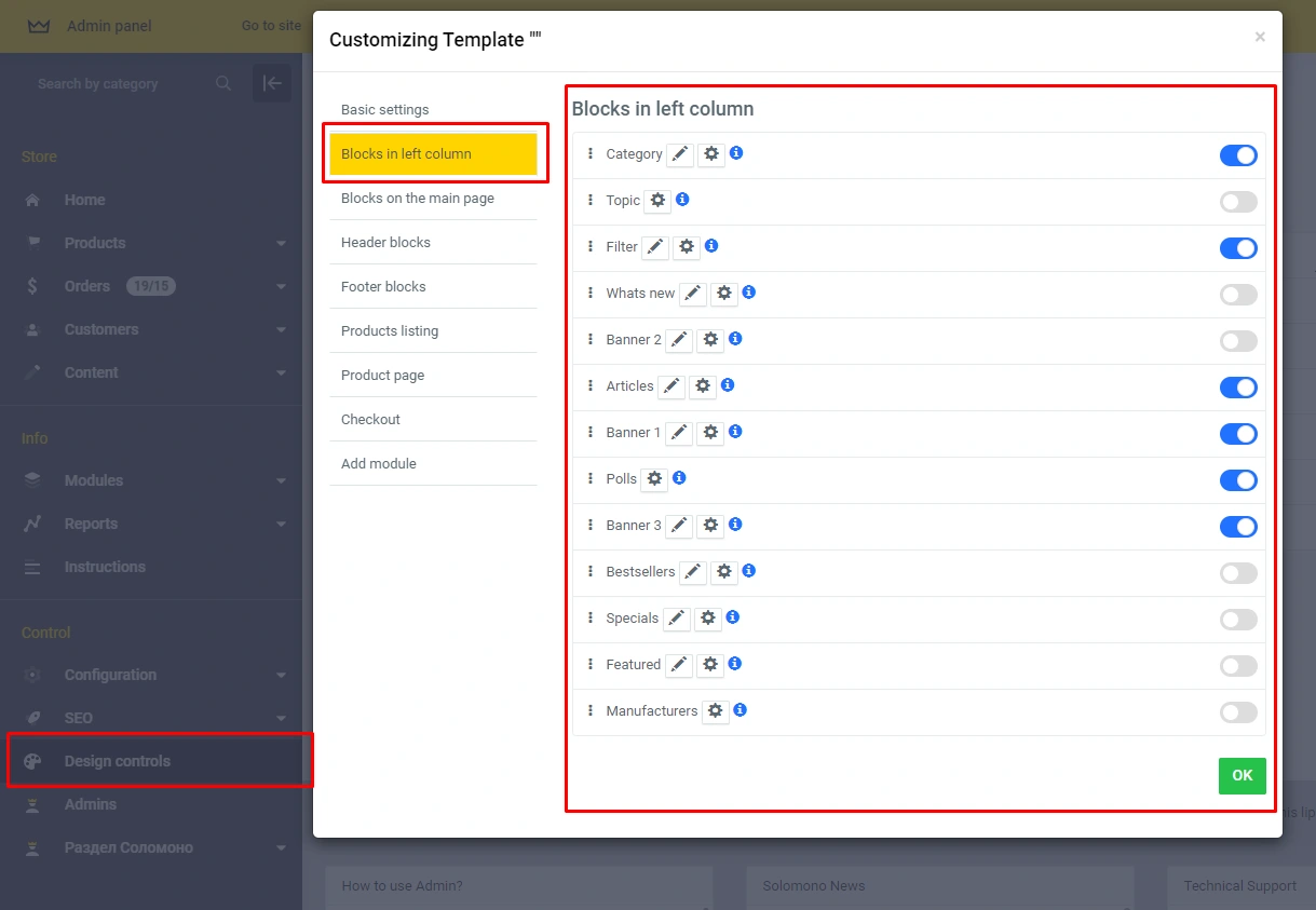In the "Top Sellers" section, you have the opportunity to directly enable/disable the sales leader block in the left column of your site