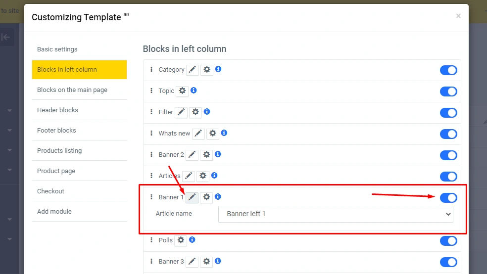 In the "Banner 1" section, you have the opportunity to directly enable/disable the banner block in the left column of your site