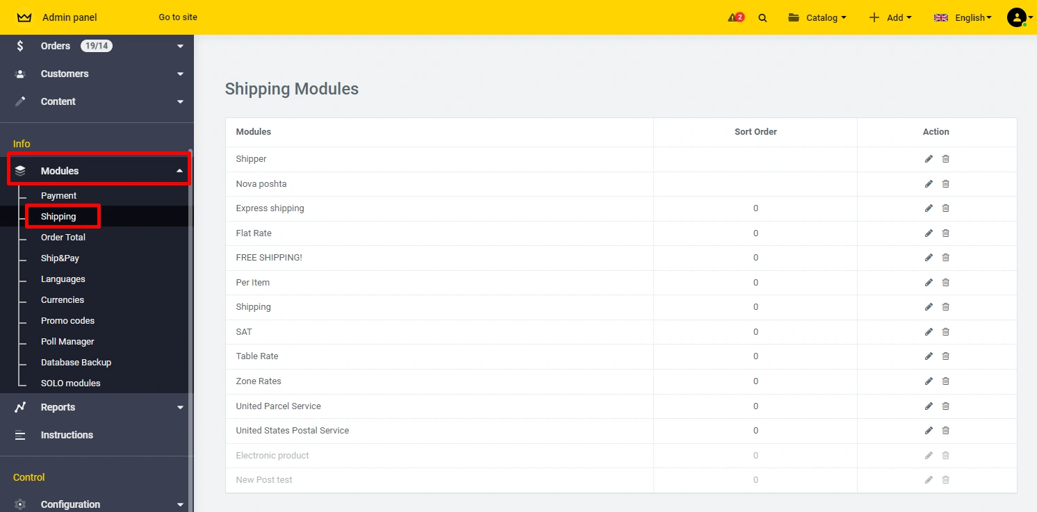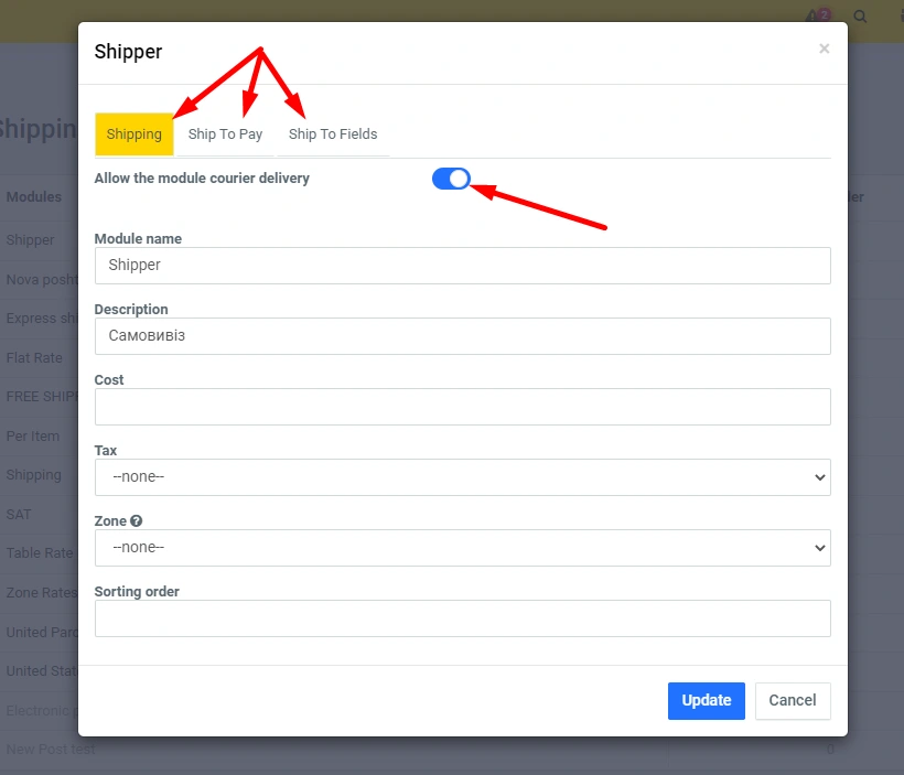 Shipper module - fixing the delivery, which you can manage yourself, change the name of the delivery, cost. In fact, the module is designed so that if you do not have other delivery methods (and without the delivery module, there is no possibility to make a purchase in the online store), then with this module you have the opportunity to install any delivery option, including free.