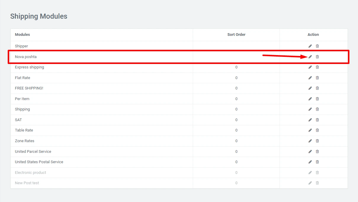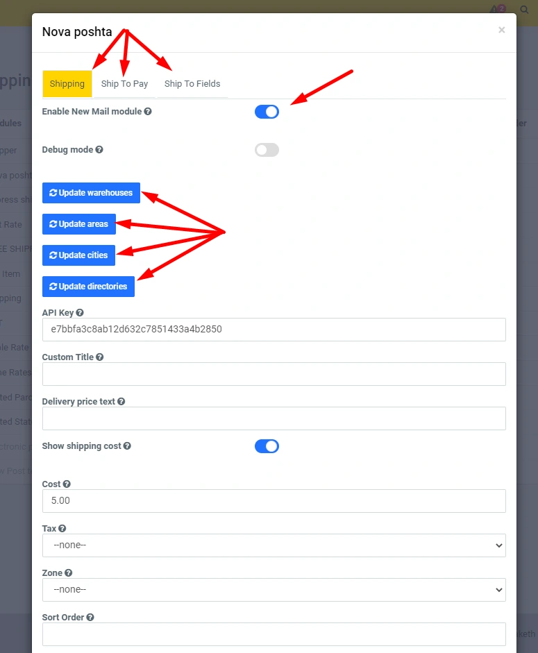 In the administrative panel, you can enable / disable the module, as well as set the delivery price, tax, zone and set the position of this module among other delivery modules. Also, this module is equipped with the functionality to automatically receive all branches and cities from the Nova Poshta database.