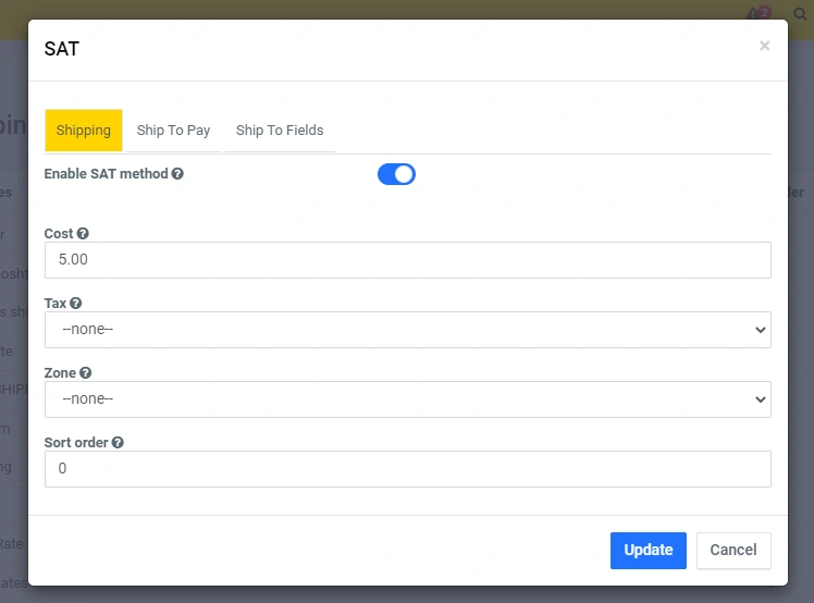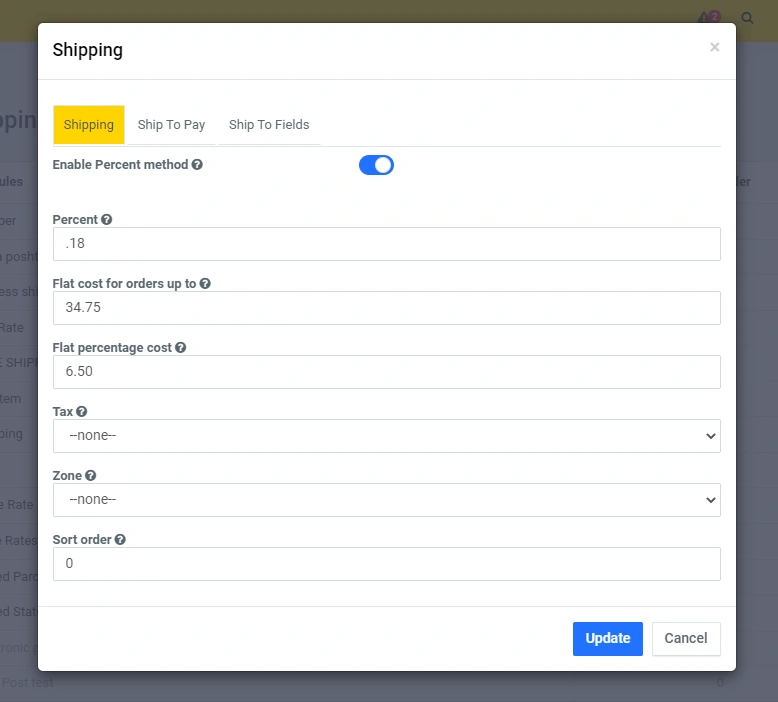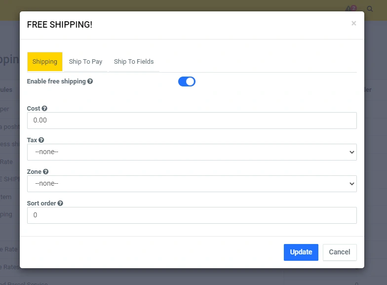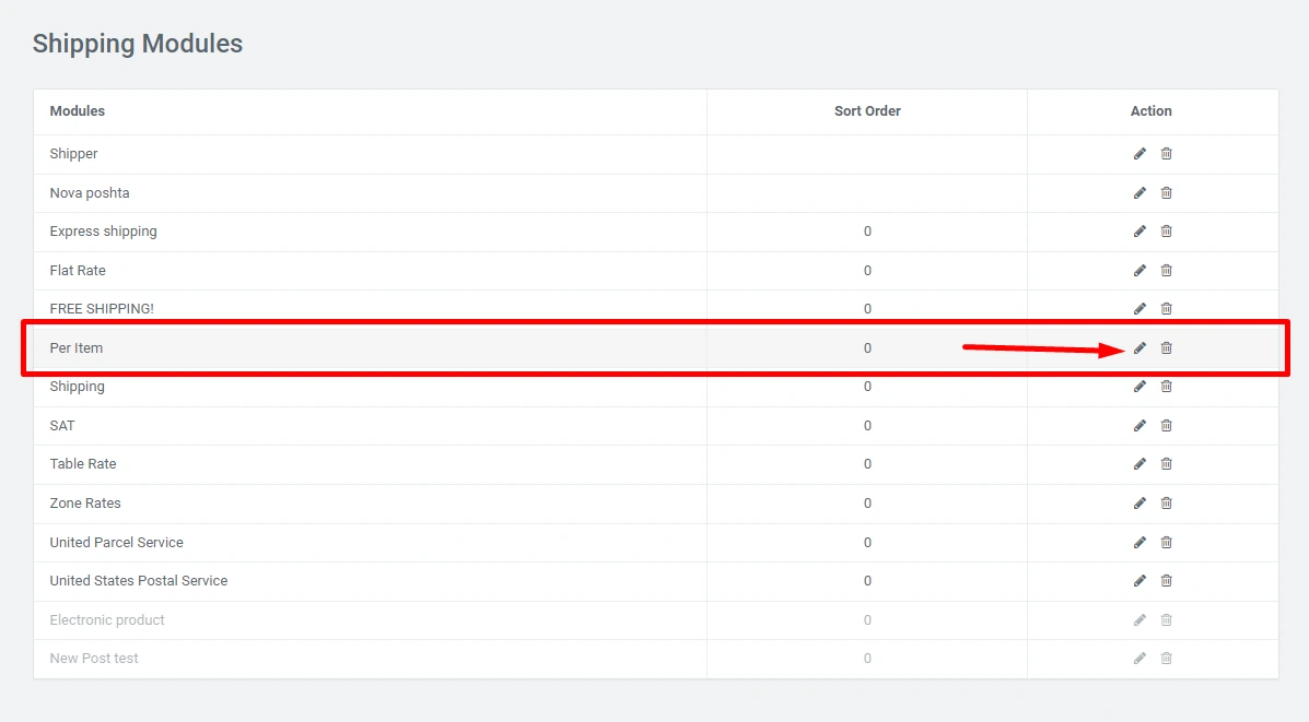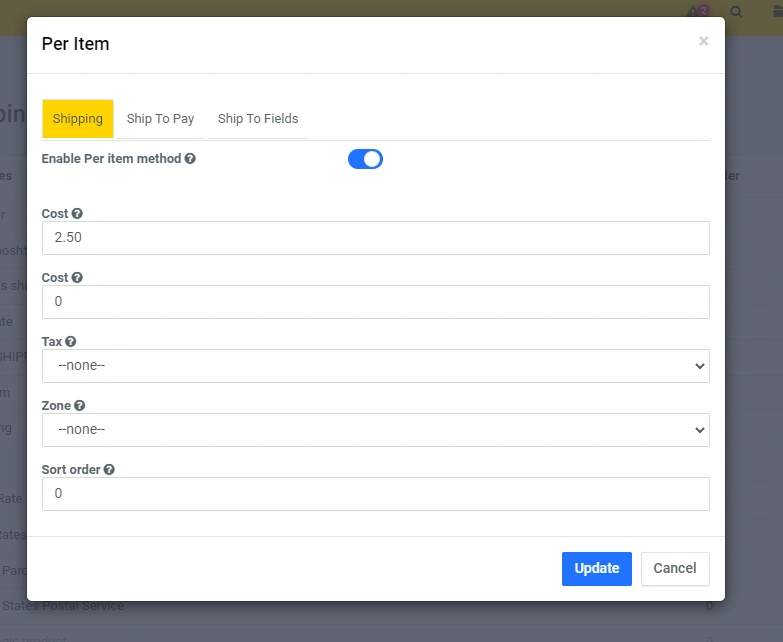Click on the edit icon, and in the modal window you can set the desired functionality at your discretion. In the line "Delivery cost" - specify the amount and then the total amount of delivery will be multiplied by the number of units in the order. For example: 4 products * by 2.5 = 10. (When you click on the "question mark" icons, you will see a prompt for the current line):
