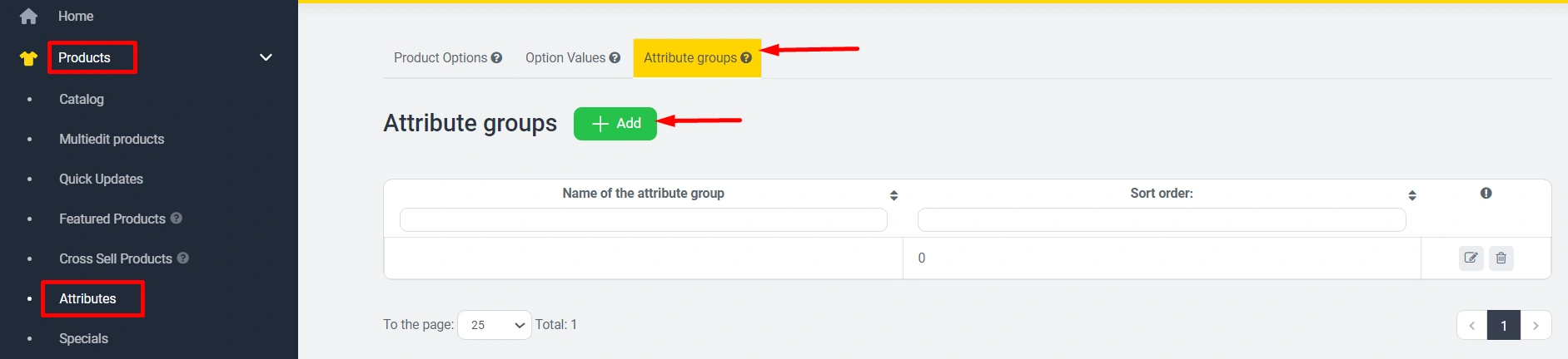 We want to combine such attributes as Width, Length, Height into one group - Dimensions. This can be done very easily. First, go to the Admin panel of your site, go to Products - Attributes and click on the Attribute Groups tab. Click on Add to create a new group: