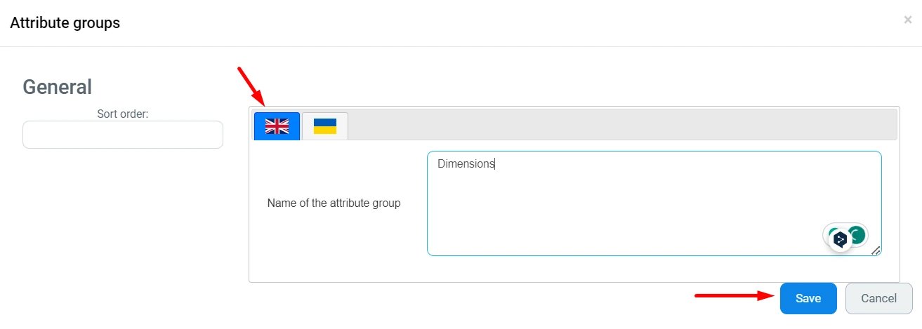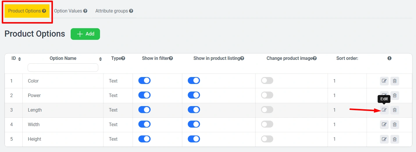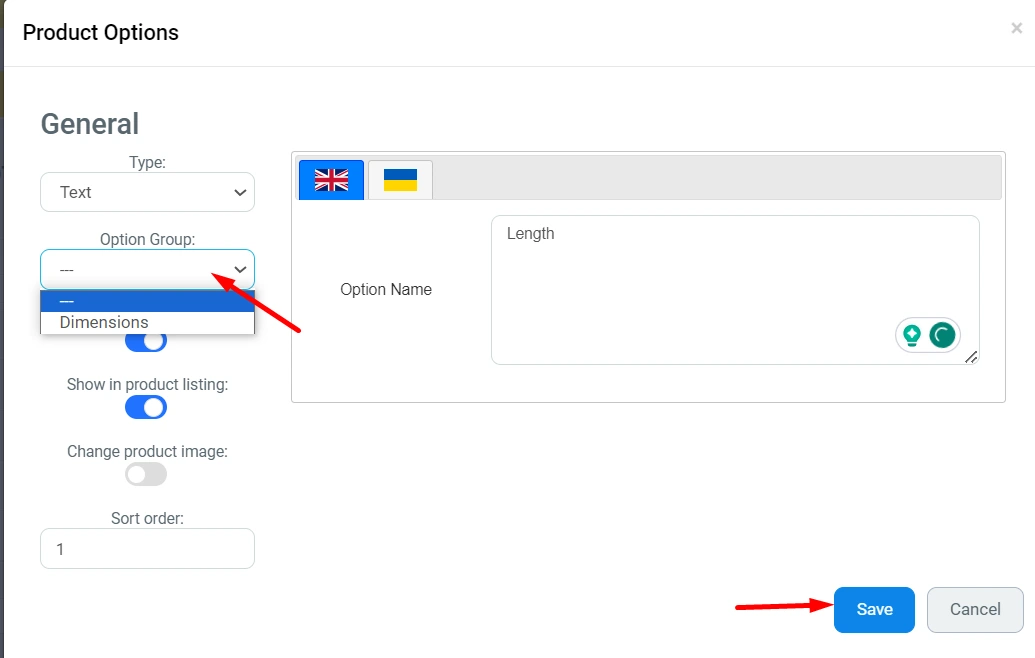Great! We have created a new group. Now we need to add the attributes that belong to this group. Go to the Product Options tab, find the attribute we need, Length, and click on Edit (pencil icon):In the Option Group list, select the required group and click Save. Do the same for the Width and Height attributes:Congratulations! You have successfully created your first attribute group. Here's how it will look like on your website:
