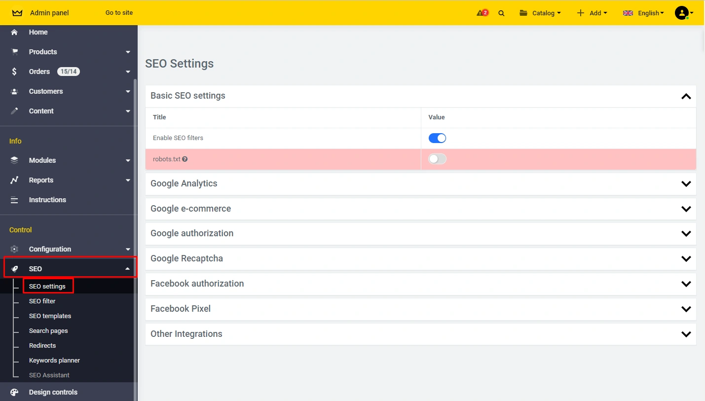 The Solomono team has developed a convenient functionality for working with SEO settings. To do this, go to the administration panel section SEO -> SEO Settings: