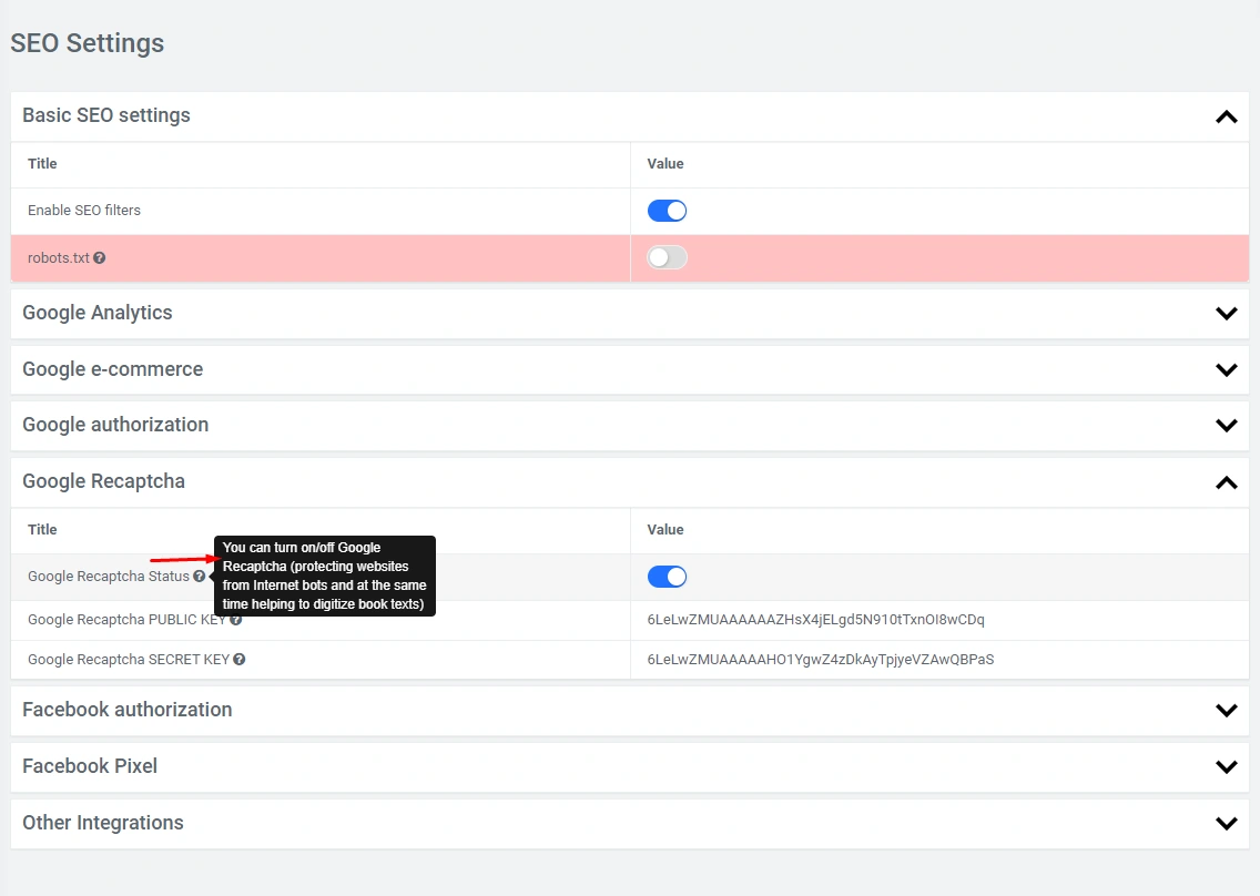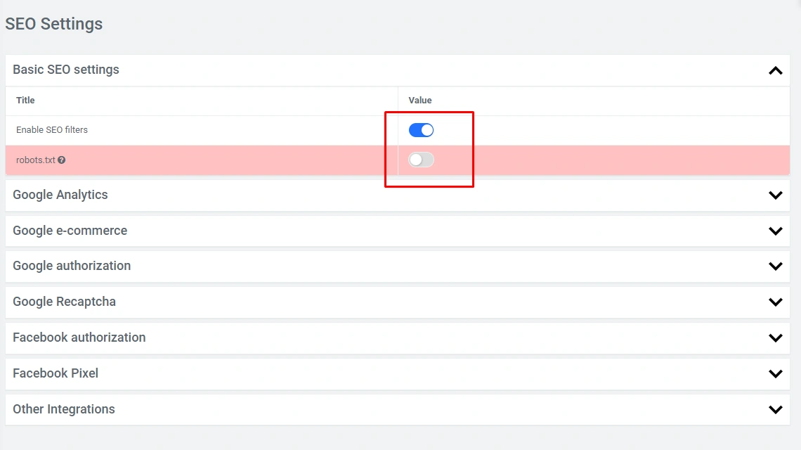 Here you have the option to enable/disable the status for the SEO settings by pressing the status button toggle: