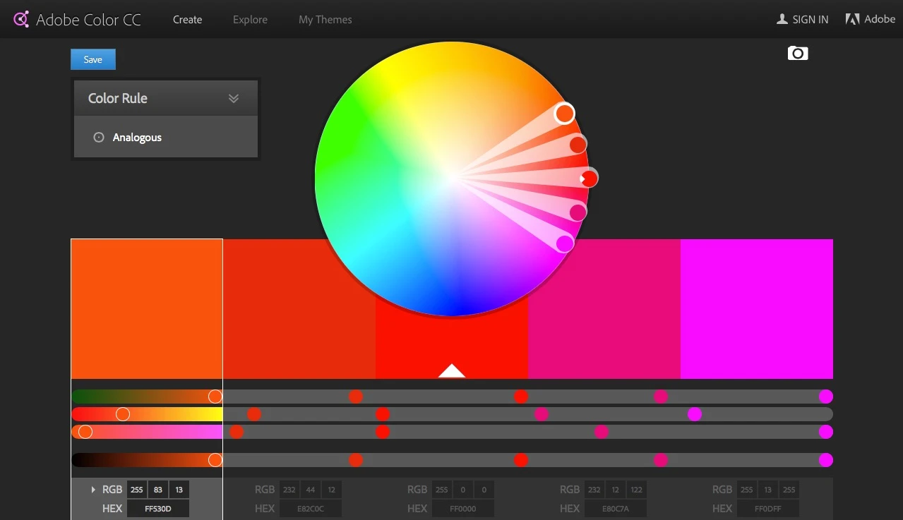 The color wheel is easy enough to use. It is in Adobe Color CC, where the selection of colors is carried out online.