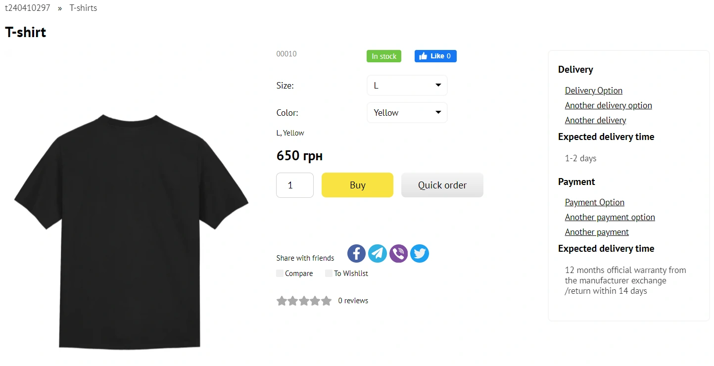 After completion, on your product page, you will be able to select different attribute values, and the price, quantity, and vendor code (SKU) will be displayed according to the settings in the combinations. For example, in this case, the "Size" and "Color" attributes in the dropdown lists are selected as "L" and "Yellow" respectively. Above the price, the line "L, Yellow" is displayed, and the price is equal to that specified for this combination - 650. Also, to the left of the "In Stock" label, you can see the SKU of this particular combination - 00010.
