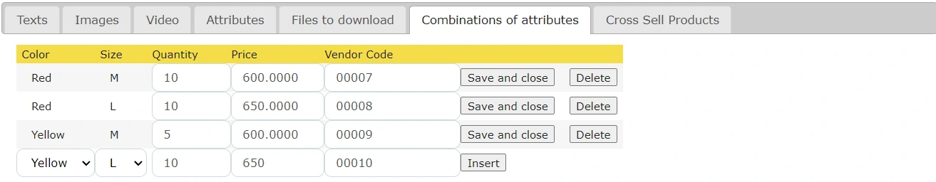 Now let's move to the "Combinations of attributes" tab. For each "Dropdown" type attribute, you will see separate columns where you can select the combinations of attribute values you need from a dropdown list. For each combination, you can specify the quantity, price, and vendor code (SKU). Once you fill out the columns, click "Insert". To delete a combination, click "Delete" to the right of it.