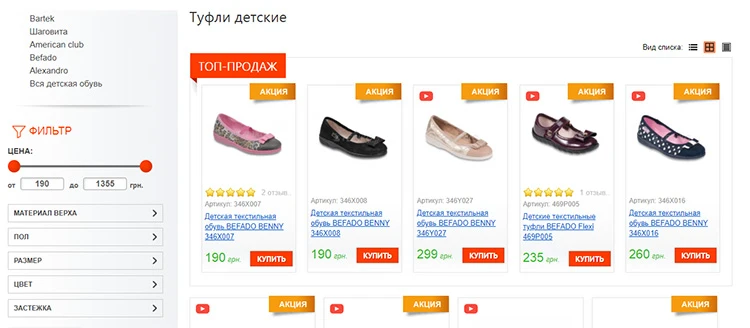 If there are several thousand products in the online store, then creating filters is mandatory. At a minimum, the store should have filters by price, season, type of shoe. The filter can be even more detailed by materials, colors, sizes, brands. You can also create a filter by purpose, for example, sports shoes, for the office, for the street, for home, etc. This option is advisable if there are such key queries and you need to advance on them.