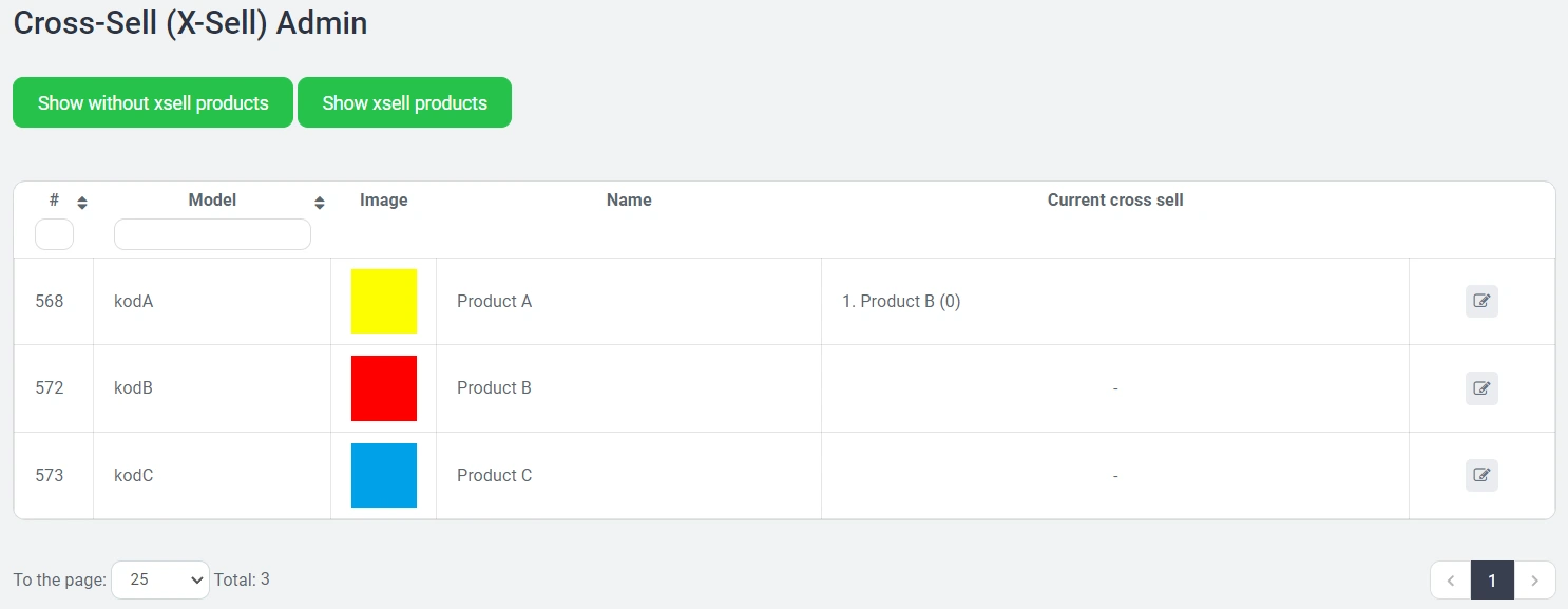 On the "Products" - "Cross Sell Products" page, a list of all your products is displayed. The "Current cross sell" column shows whether a particular product has related items and, if so, which ones.