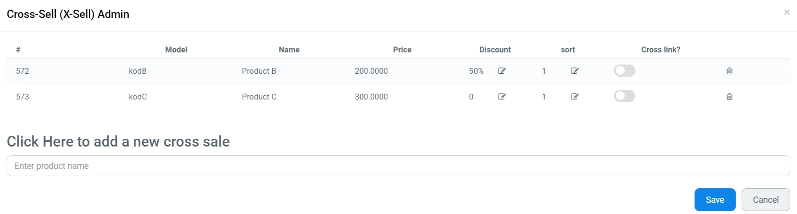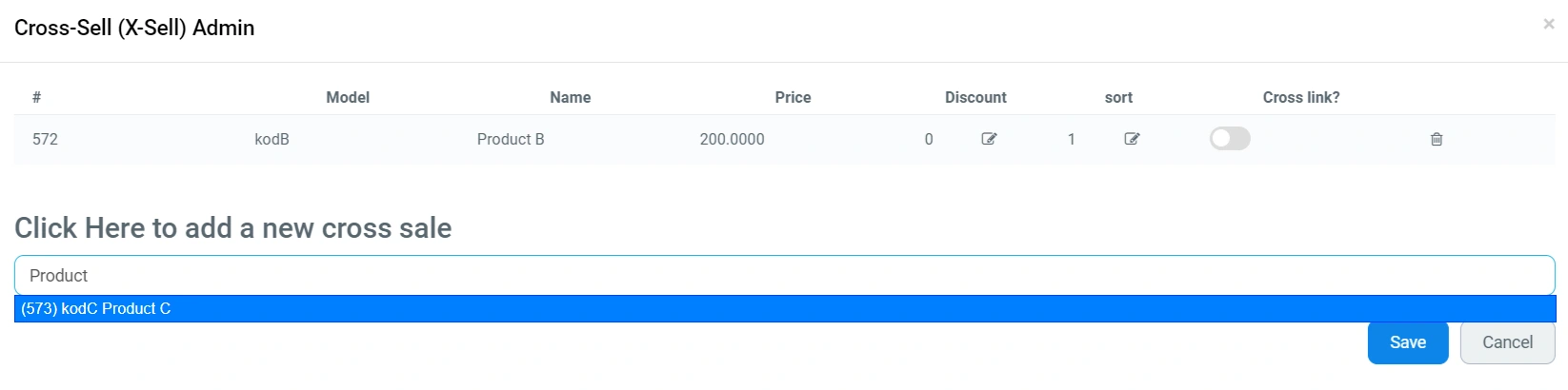 To add a related product, click on the "Edit" button in the last column next to the product to which you want to add a related one. In the window that opens, you will be able to see the current related items for the selected product, configure them, and add new ones. To add a new related product, enter its name in the "Click here to add a new cross sale" field and click on the found product in the dropdown list.