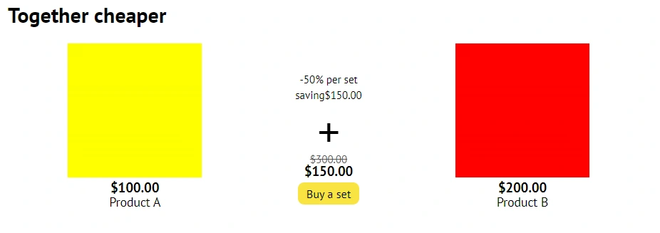 After adding a related product, you can see its model, name, and price. Additionally, you can specify a discount for the set of related products in the corresponding column. If you do this, the "Together cheaper" block will appear on the main product page. In the case shown in the screenshots, the main product is product A, which has related products B and C, and a discount of 50% has been set for the set of the main product with product B. The discount is voided if a coupon is used.