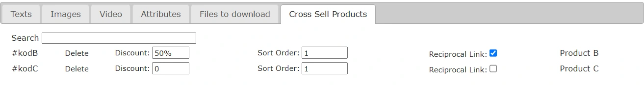 Similarly, you can work with related products on the "Products" - "Catalog" page - the product editing window - the "Cross Sell Products" tab. To add a related product, enter its name in the "Search" field and select it from the dropdown list. After adding, you can configure it, specify a discount, set the sorting order, and set a reciprocal link.