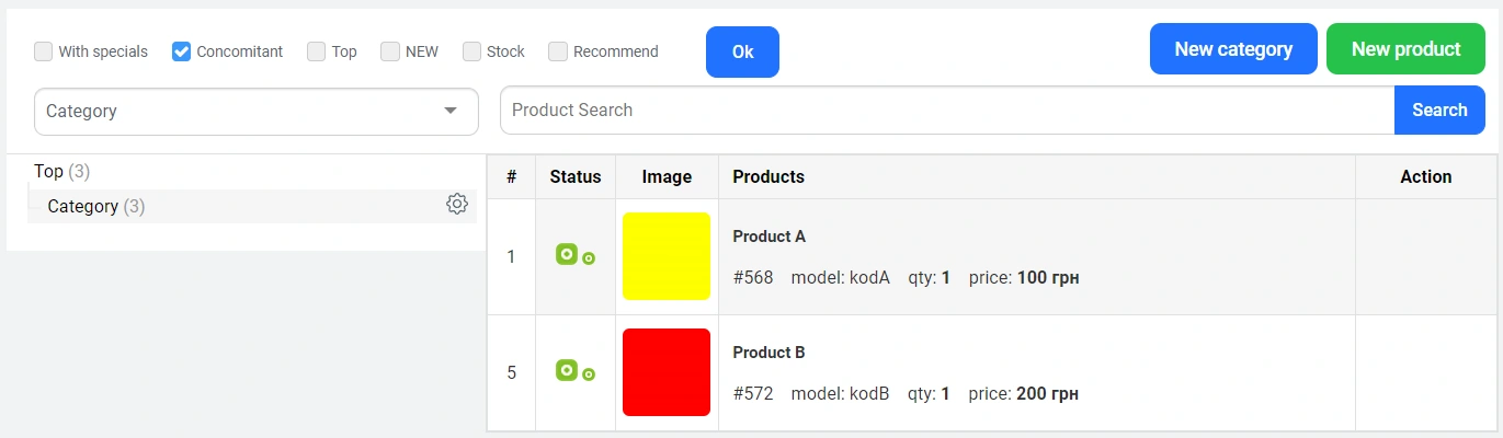 Additionally, on the "Products" - "Catalog" page, you can check the "Concomitant" filter and press "Ok" to display only products that have related items in the list.