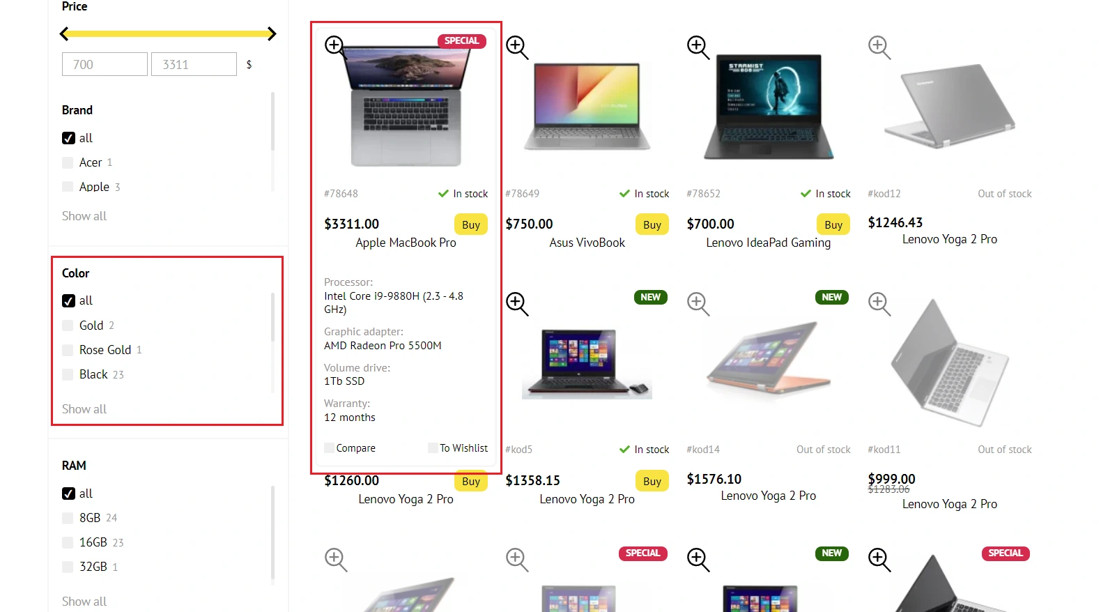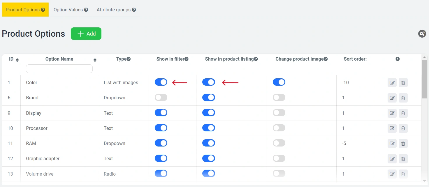On the "Products" - "Attributes" page, you can specify whether to show a certain attribute in the filter and whether to display it in the list when hovering over a product with such an attribute. The switches "Show in filter" and "Show in product list" respectively are responsible for these settings.