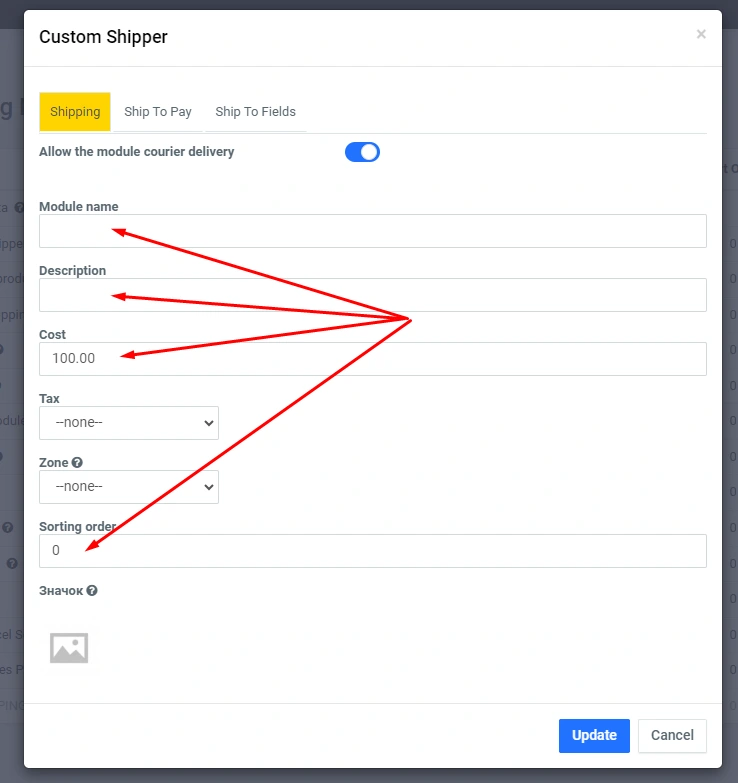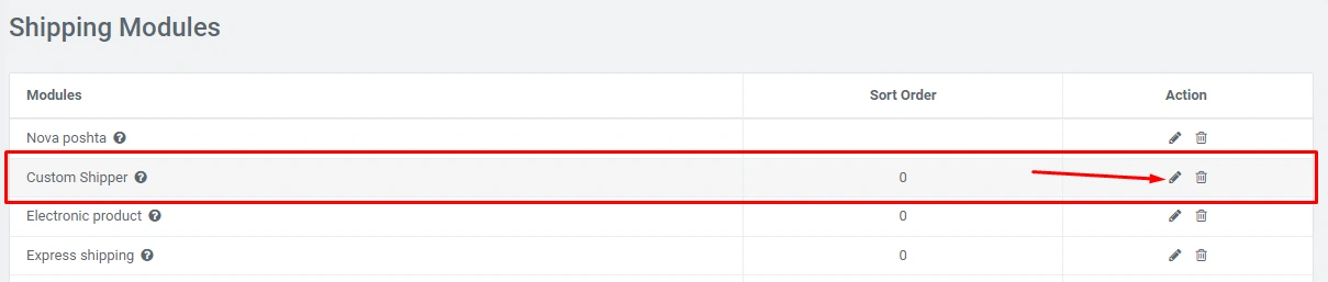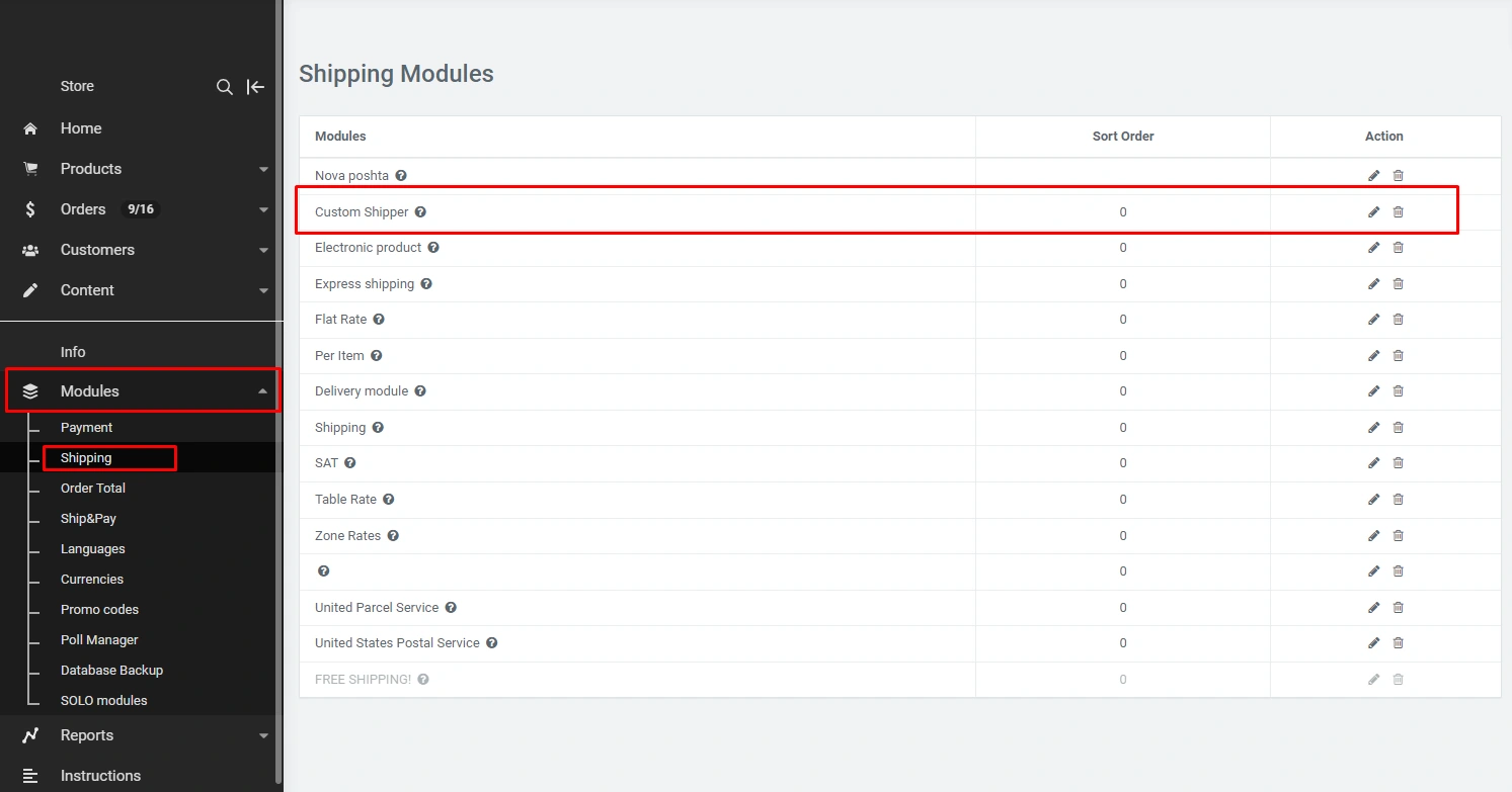 To get started, enable the "Carrier" module itself, to do this, in the administration panel, go to "Modules" -> "Delivery" -> "Custom Shipper " if it is not active for you, click on the "+" icon