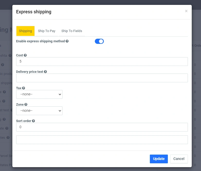 You will go to the modal module settings window, here you can set, for example, the sort order, the amount, where in the column "Delivery price text" the amount can be written in words, or you can leave it only as a number, but then leave the last text field empty: