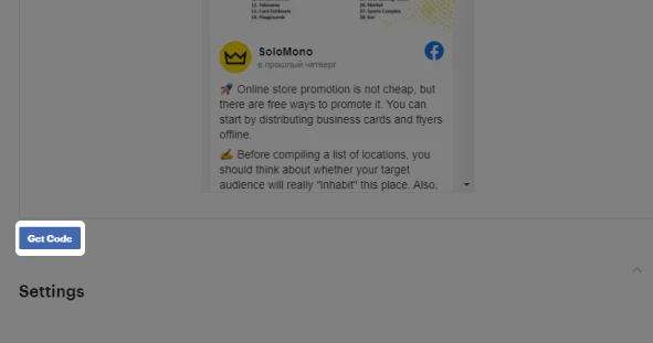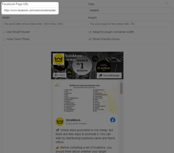 On the page that opens, you need to enter your Facebook page URL (for example: https://www.facebook.com/solomonotemplate/)