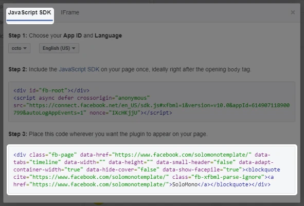 In the window that opens, on the tab "SDK Java Script" copy the code from step number 3, which we, later, will need to insert on the site.