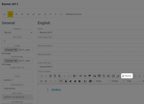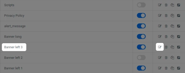 To do this, we will go to "Content / Pages / Blocks" and to the right of the title "Banner left 3" press "Update".