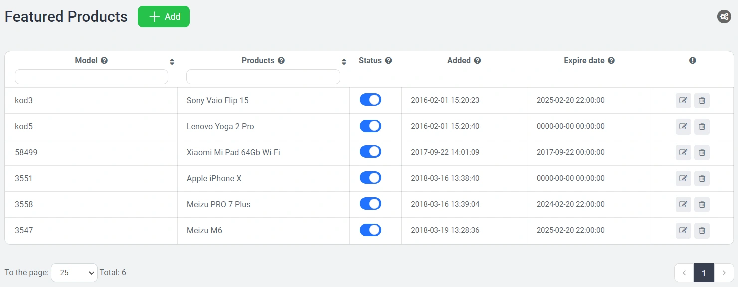 You can manage featured products on the "Products" - "Featured products" page in the admin panel. Here, you can see a list of your featured products, their model (SKU), name, status, the date the product was added to the featured list, and the date until which the product will be considered featured. If you turn off the switch in the "Status" column, the product will no longer be displayed in the "Featured products" block. In the last column of the table, you can open the editing window for the selected product, or delete it by pressing the corresponding button. To add a featured product, click "Add".