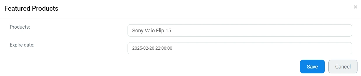 In the window that opens, enter the name of the product you need in the "Products" field and select it from the dropdown list that appears. In the "Expire date" field, you can specify the date until which the product will be considered featured. If you leave this field empty, the display term of the product in the "Featured products" block will be unlimited. After completing, click "Save", after which the product will appear in the list of featured products.