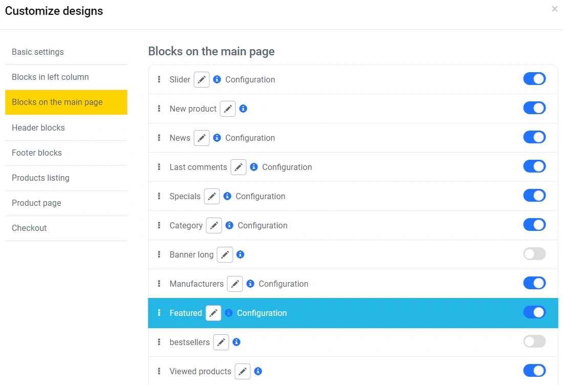 To ensure that the "Featured products" block is displayed on the homepage, make sure that the "Featured" switch is turned on in the "Design" page under the design settings of the template, in the "Blocks on the main page" tab.