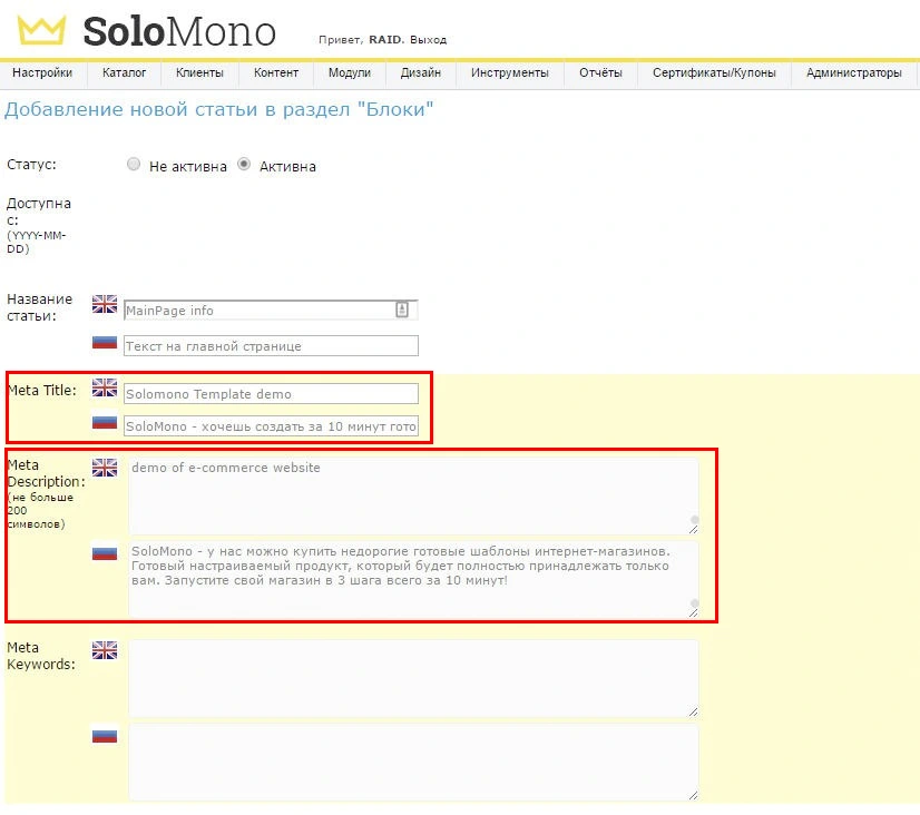 Вначале нужно поменять тэги главной страницы, а потом прописать тэги для каждого раздела и товара. Все эти действия можно осуществить в нашей админке.