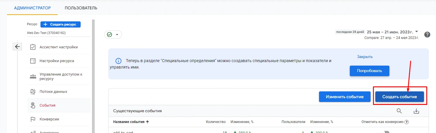 Also, in addition to setting up tracking of page visits, Google Analytics 4 also has the following basic goals: button clicks; sending the form; click on e-mail; click on the phone number; uploading files. But setting these targets requires code intervention.