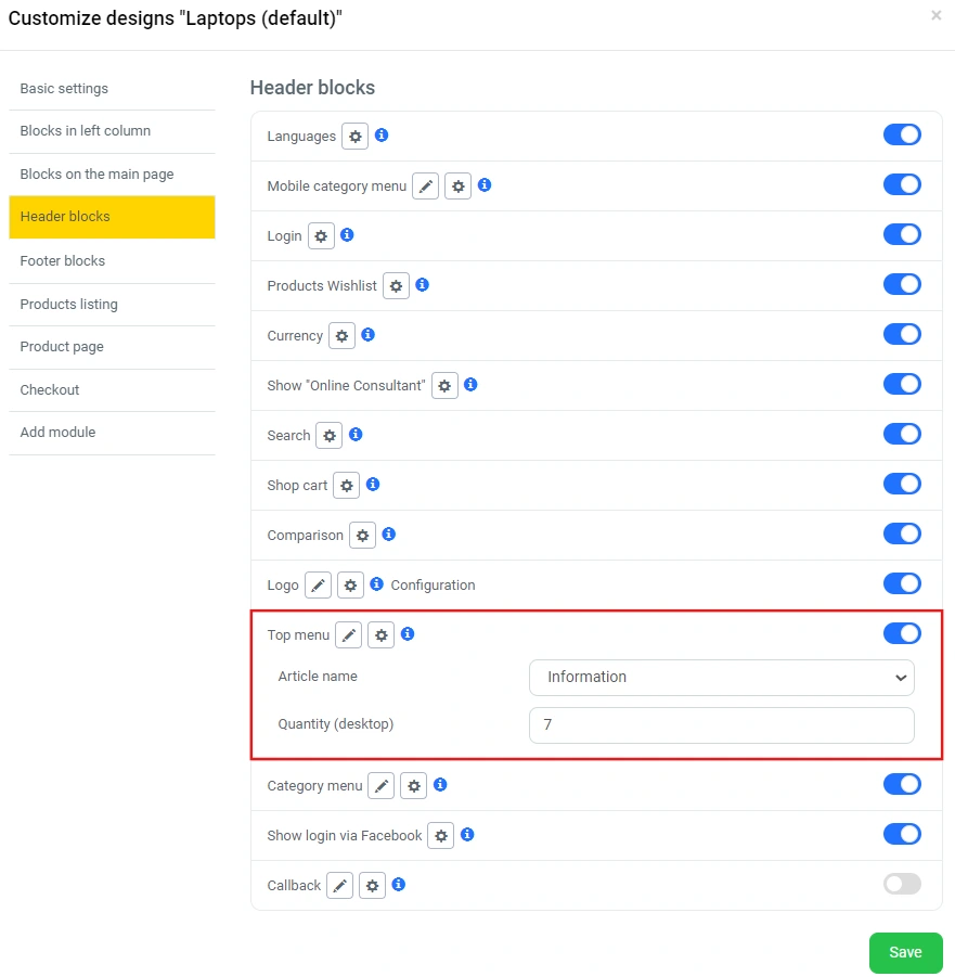 On the "Design" - "Template settings" - "Header blocks" - "Top menu" page, you can see which article section corresponds to the items displayed in the header of your store. By default, this is the "Information" section.