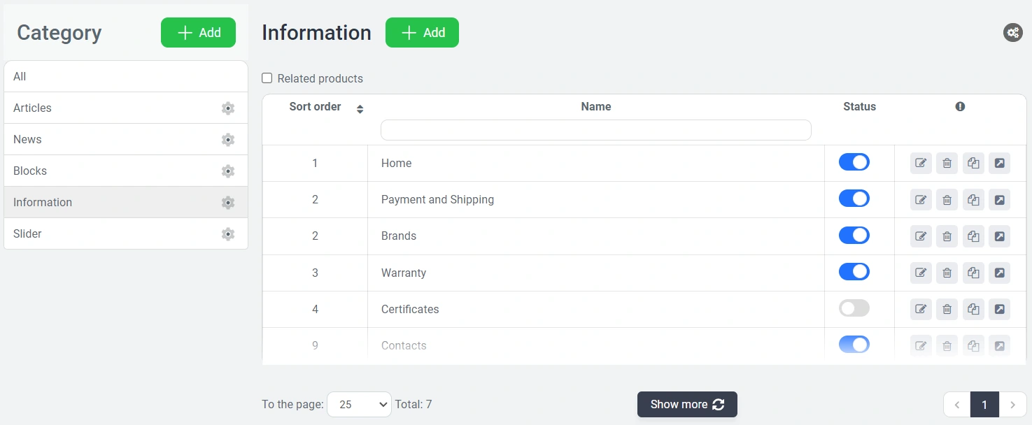 To add a new item to the header, on the "Content" - "Pages" - "Information" section page, click "Add" and fill in the required fields in the window that appears. After saving, you will see a new article in the list of articles of the section, as well as in the header of your store.