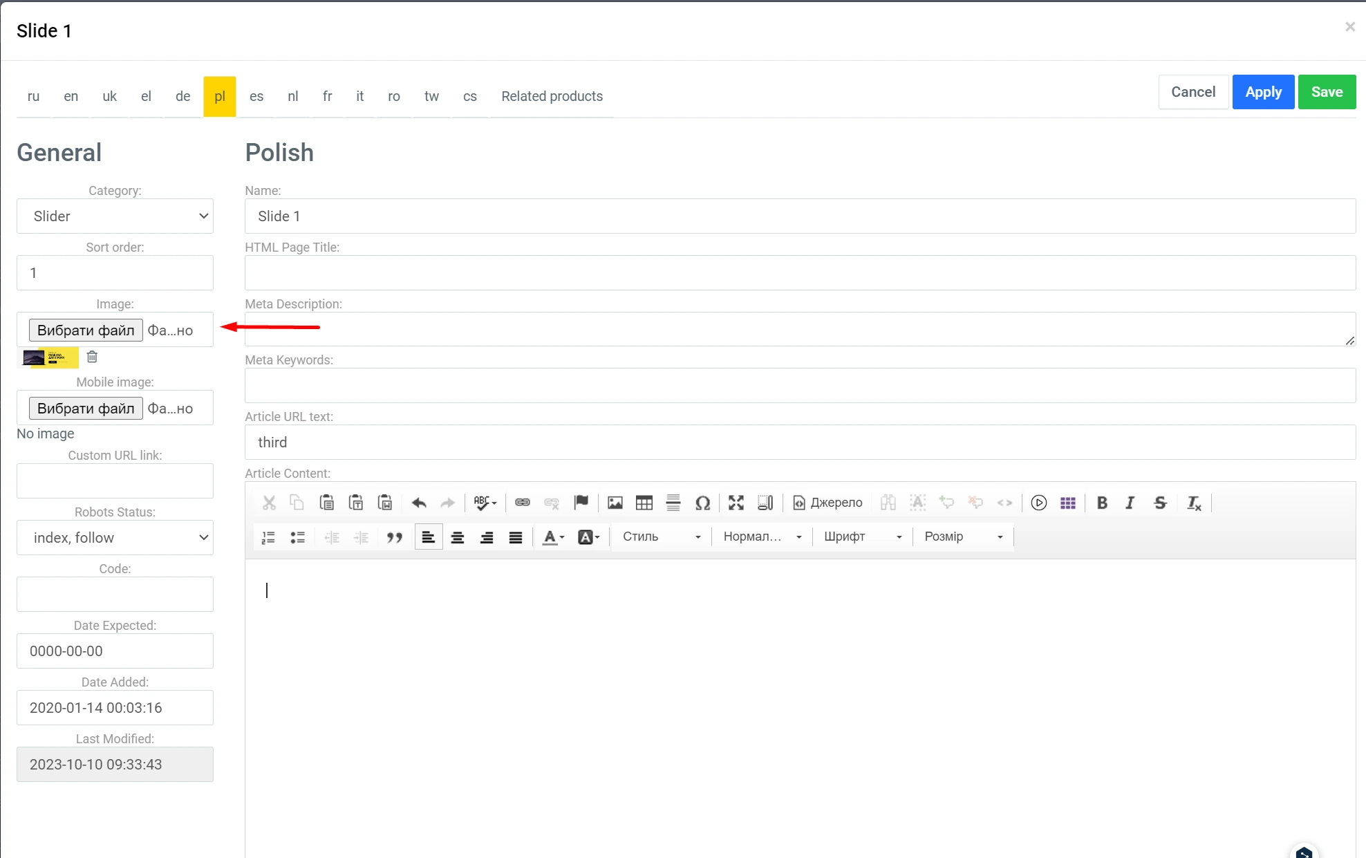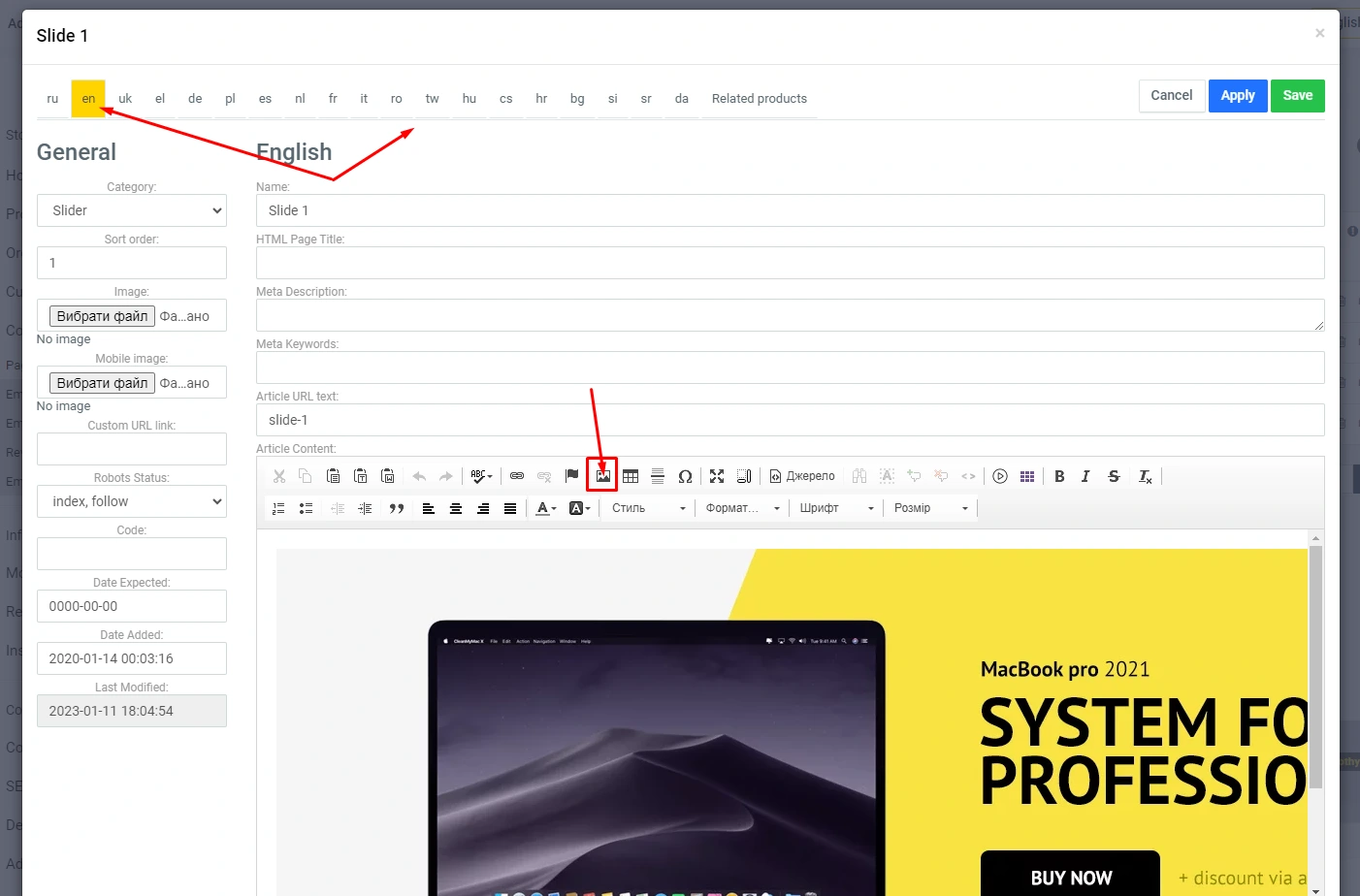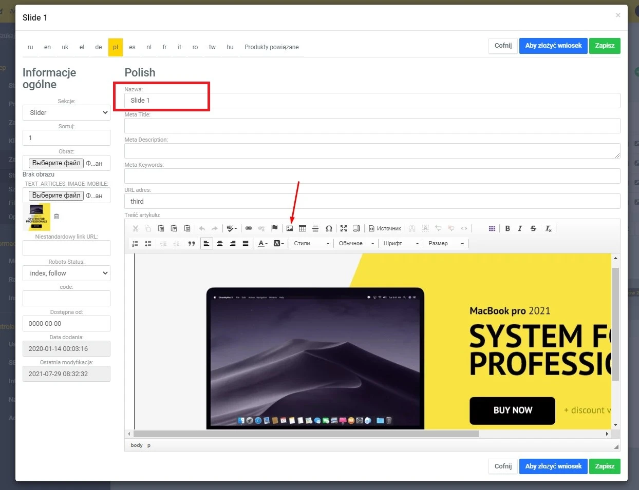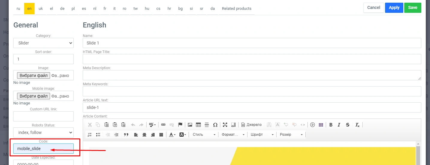 You can also upload a separate slide for mobile devices. To do this, click the image icon in the text editor and enter "mobile_slide" in the "Code" field.