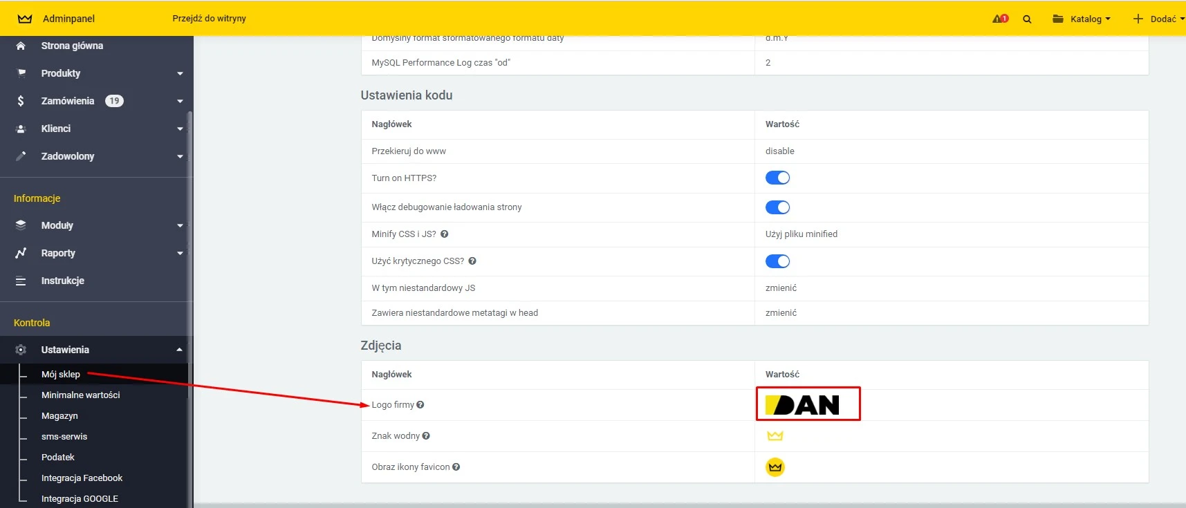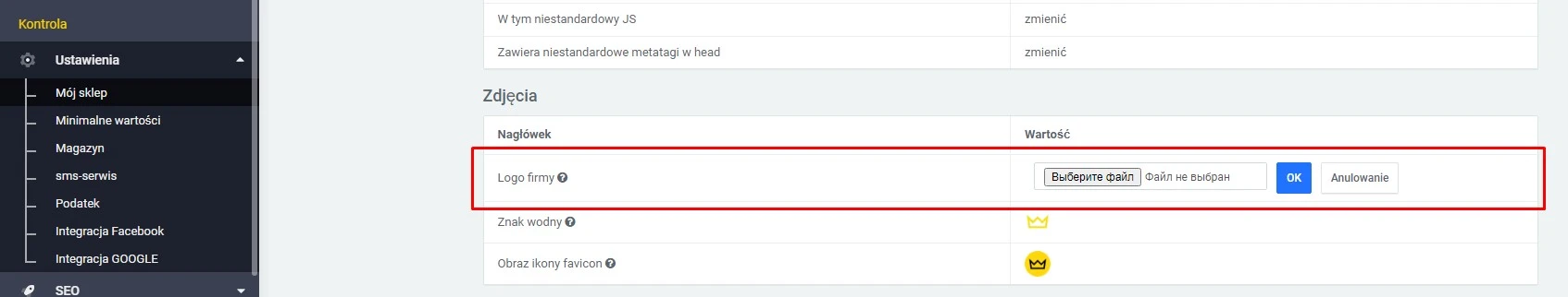 To change the store logo, go to "Settings" → "My Store". In the new window, locate the "Company Logo" section, click "On", choose the desired image file, and confirm with "OK".