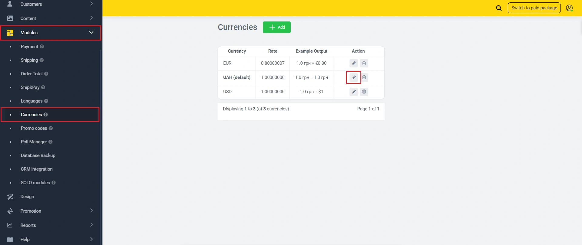 You can adjust the display of decimal places in the currency settings. Navigate to the "Modules" -> "Currencies" page and access the editing menu: