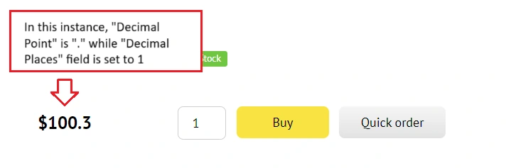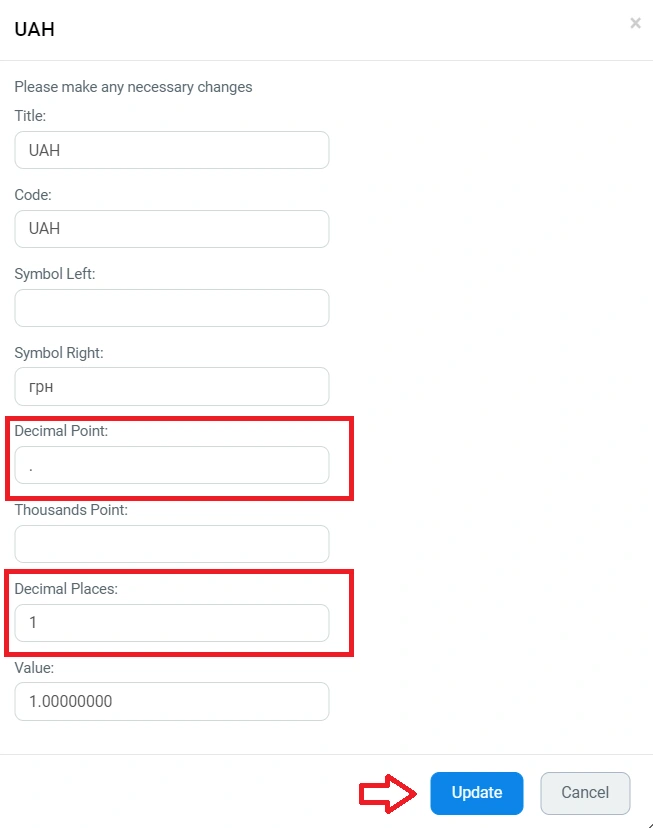 In the "Decimal Places" field, you specify the number of digits after the comma that you want to display in the prices on your site. For instance, if the price is 100,25 UAH and you set the decimal places to 1, you will see 100,3 UAH - one digit after the comma, rounded to the nearest tenth.