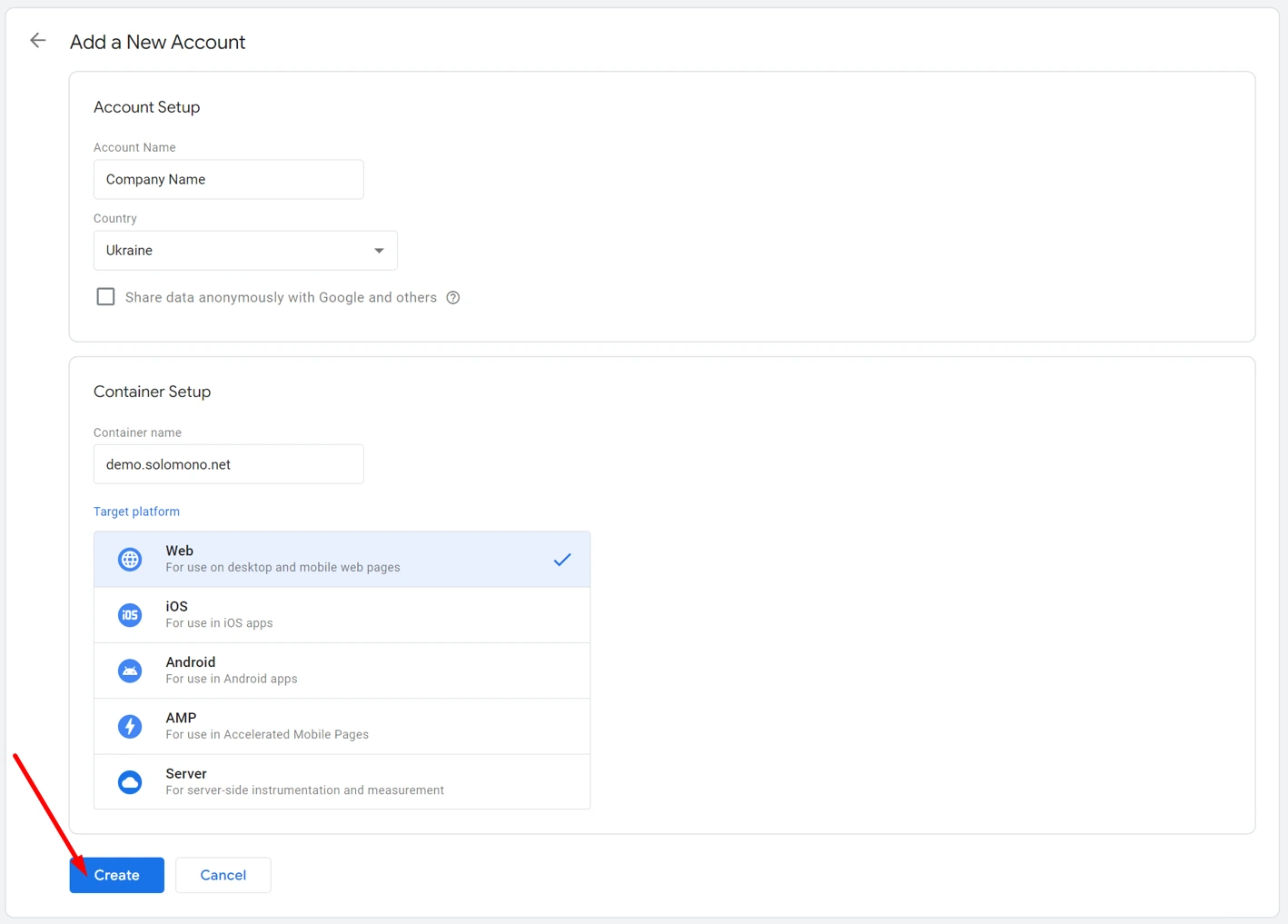 After filling in the data, click "Create" and agree to the terms of service in a separate window, after which your Google Tag Manager account will be created.