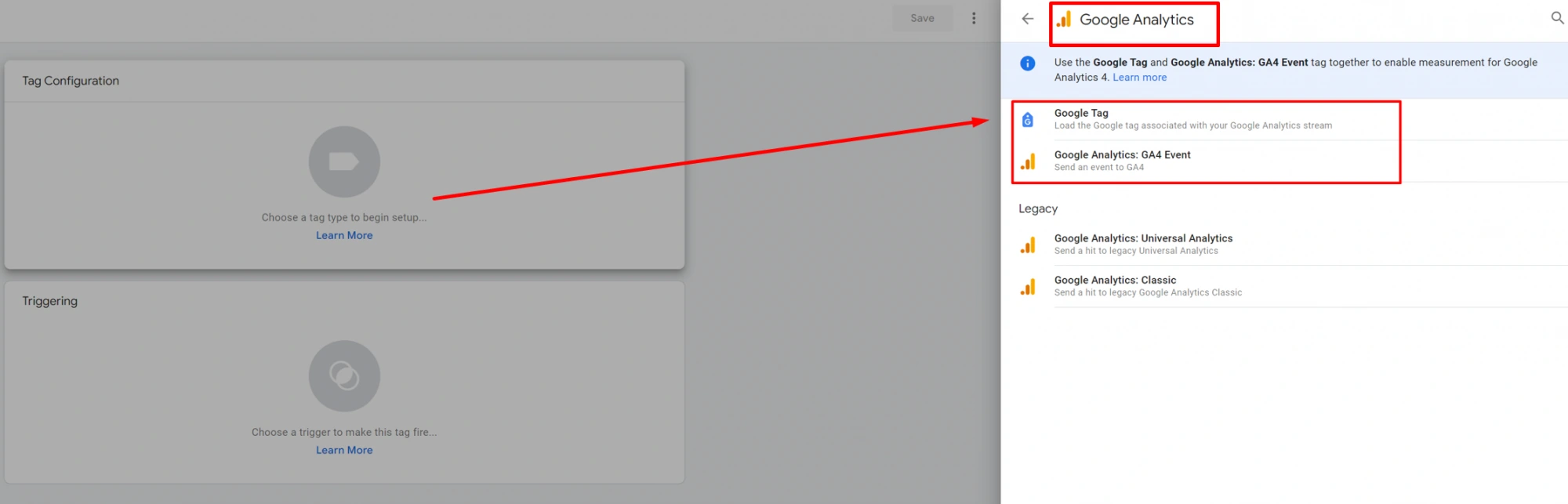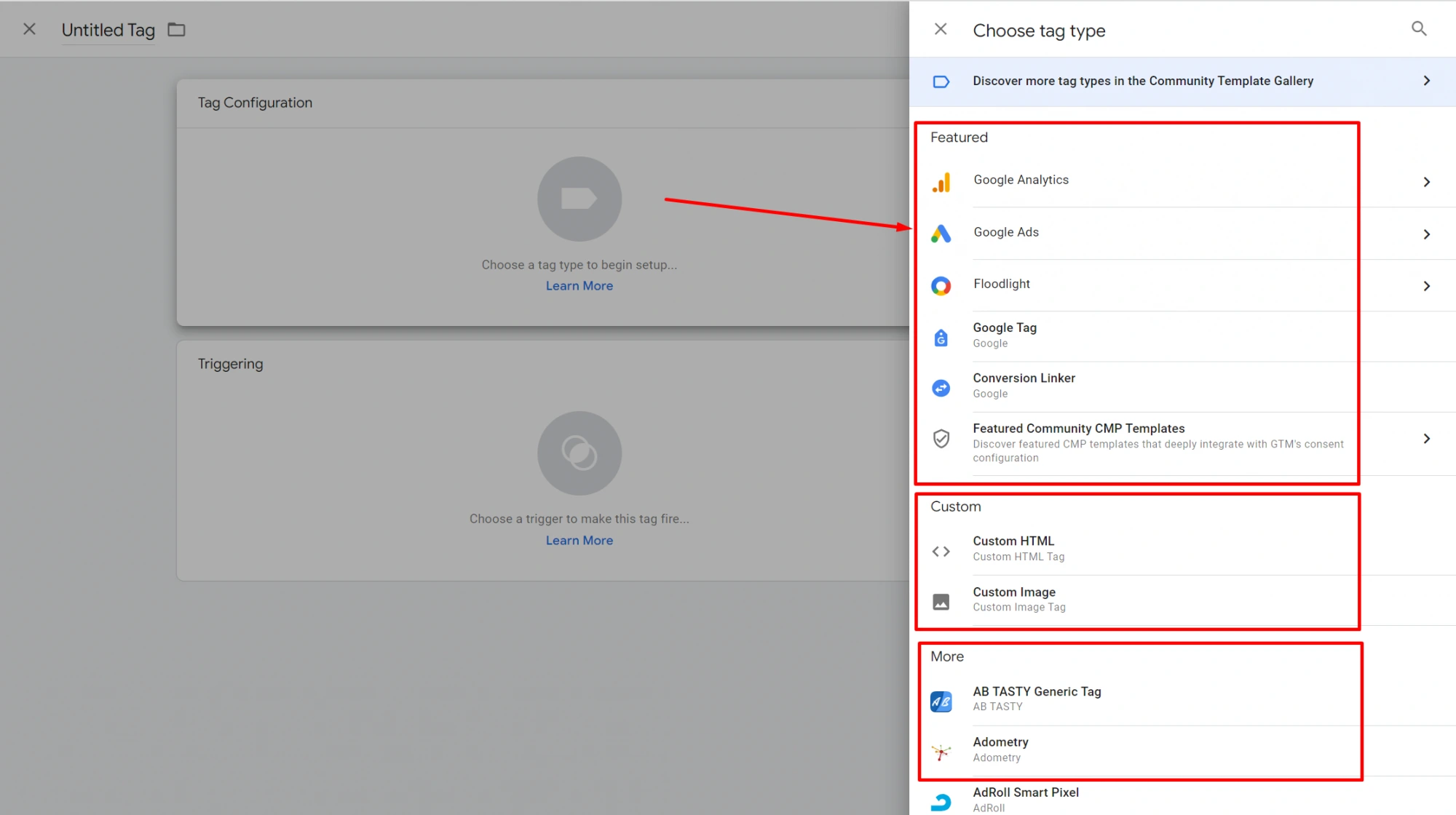 If you need to connect another tag, for example, Google Ads, you need to click on Tag Configuration and select Google Ads or the tag you need.