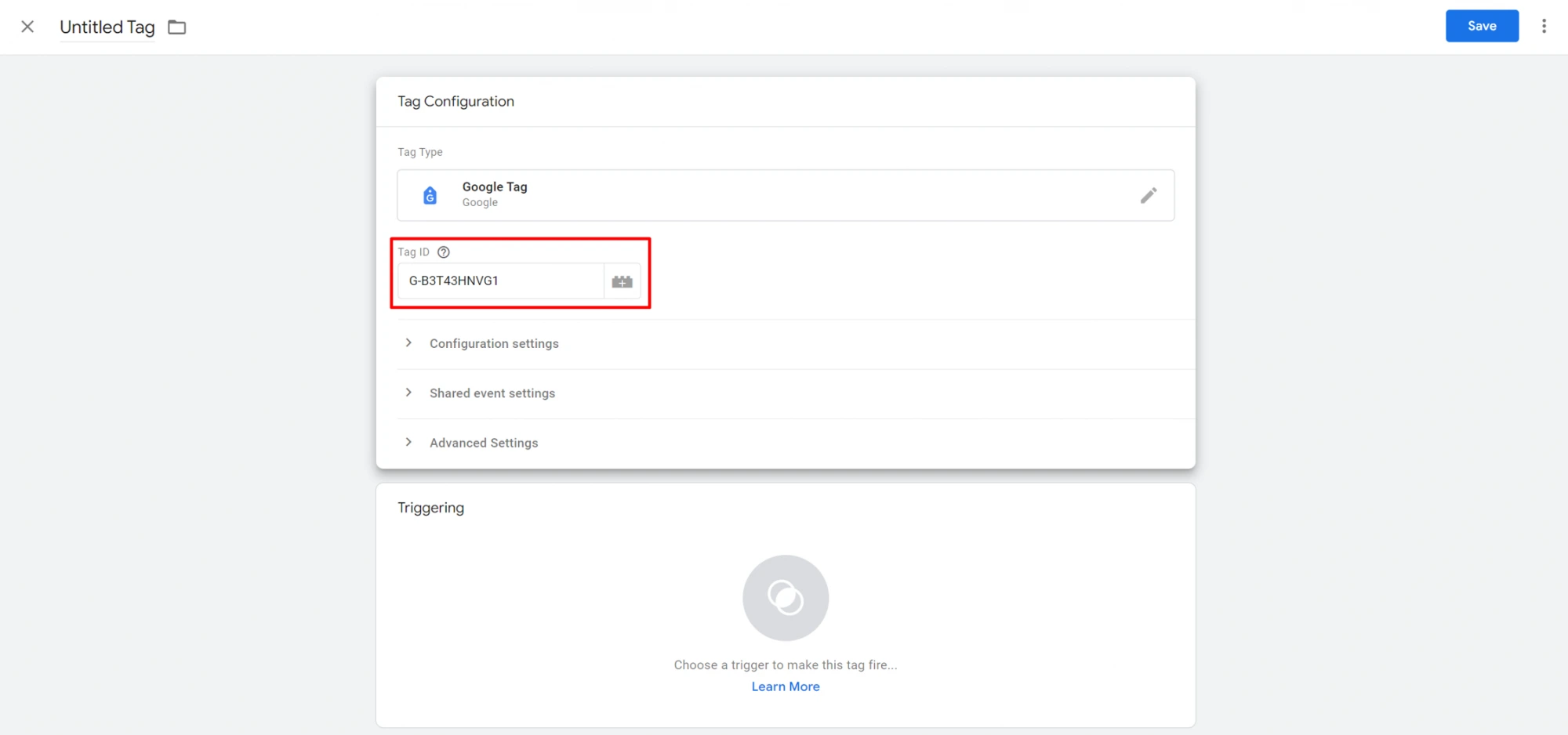 In the window that appears, there are two fields: in the first "Tag Configuration" field, you need to select the tag that will be displayed, and in the second "Triggering" field, you need to specify the conditions when this tag will be displayed on the site.
