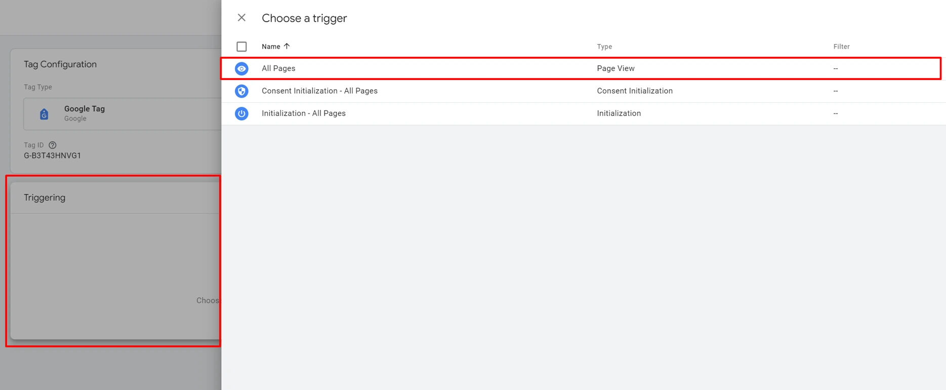 After that, you need to configure the conditions when this tag will work on the site. To do this, select Triggers and a condition, for example, All pages: