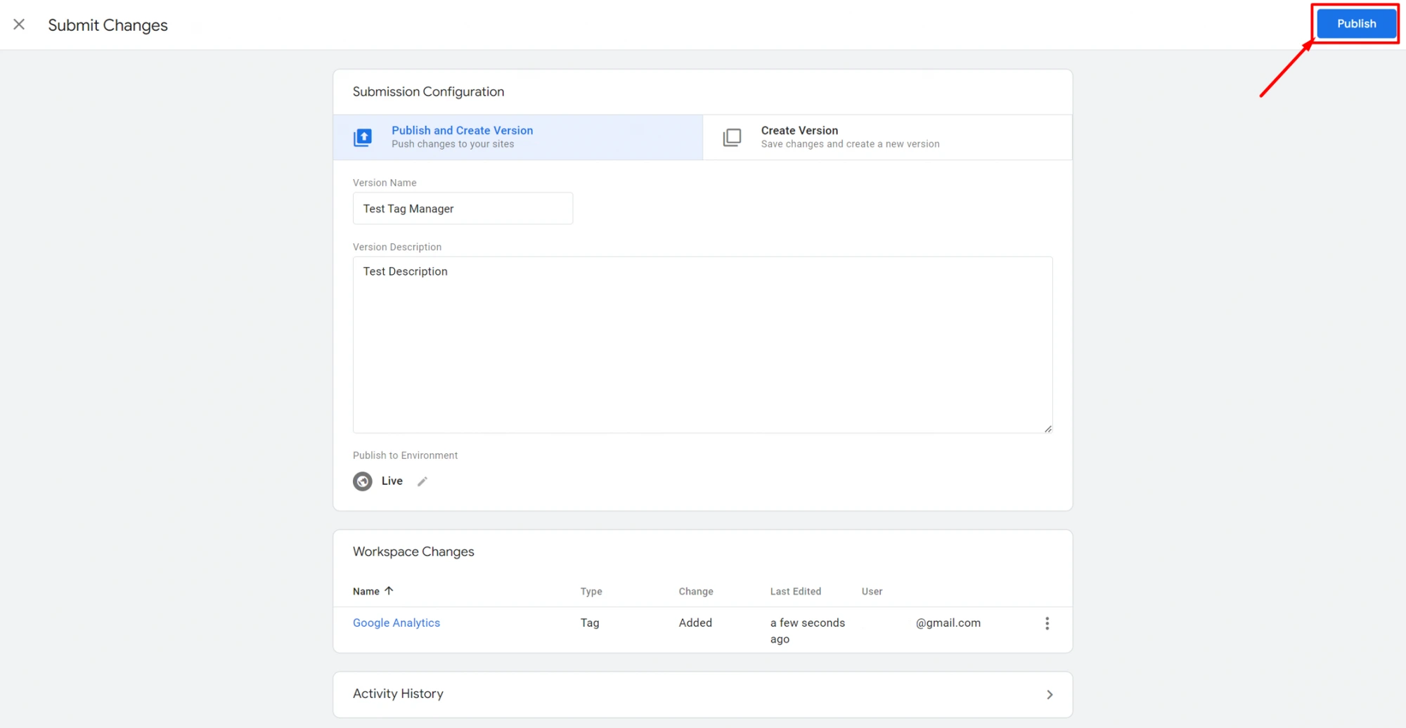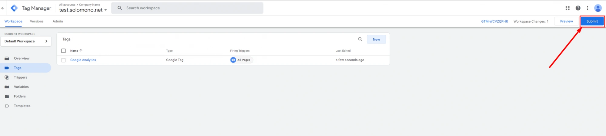 When all the tags are configured, you can publish the Google Tag to make it work and save all the settings. To do this, click "Submit" in the right corner of the page: