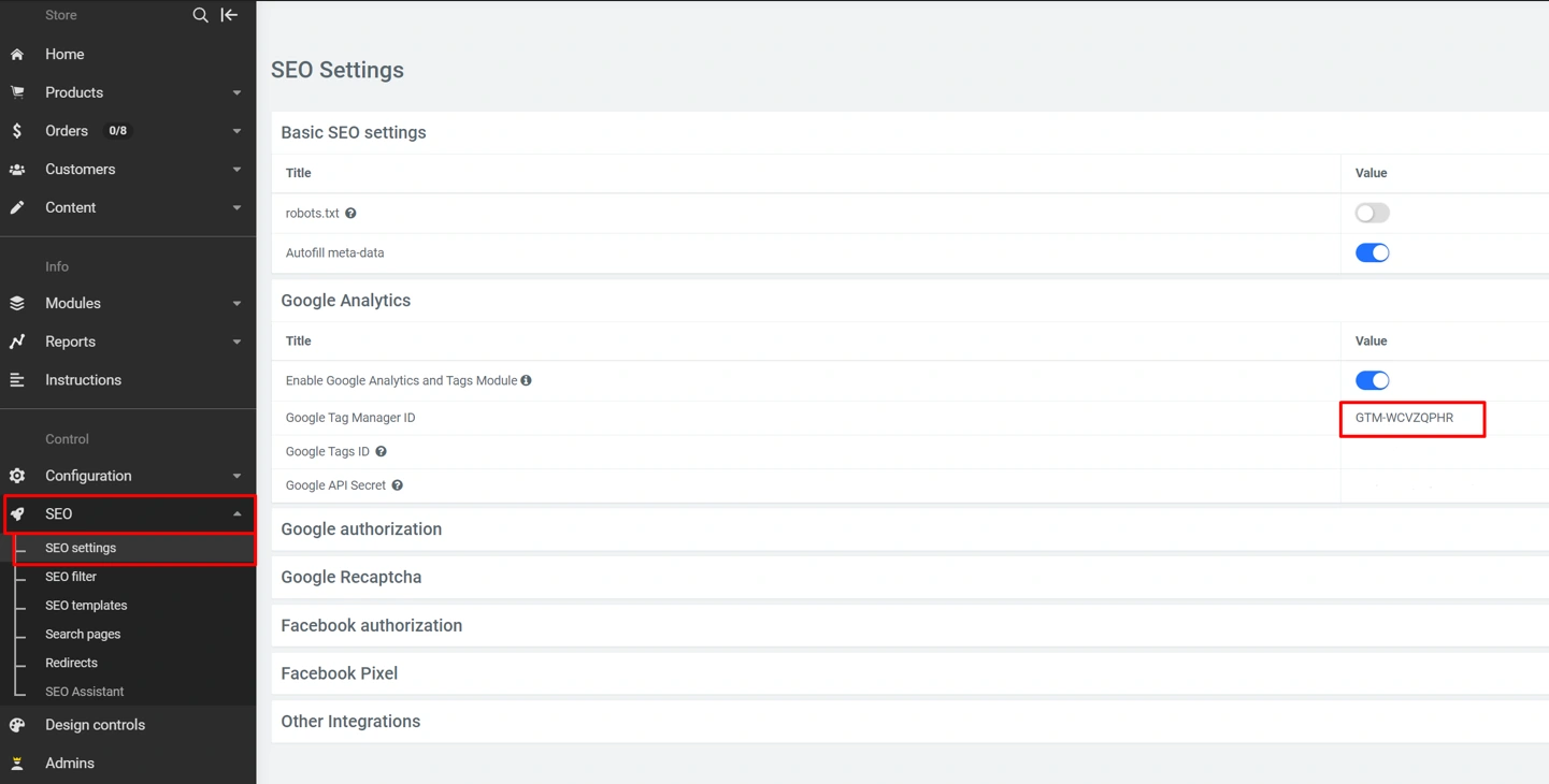 Next, you need to go to the admin panel of the site in SEO -- SEO Settings and find the Google Tag Manager ID setting there, insert the tag and save: