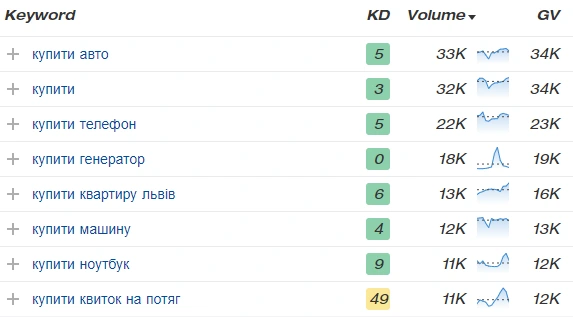 This is where you can spend a few hours to sort out and find interesting keywords. For example, we recommend searching for the phrase “buy” in your region, while setting the “key complexity” to no more than 3-5. You need to search for the larger the value of Volume - this is the number of requests for this keyword per month. Of course, “buy” is not the only suitable query for this study, you can try other options as well.